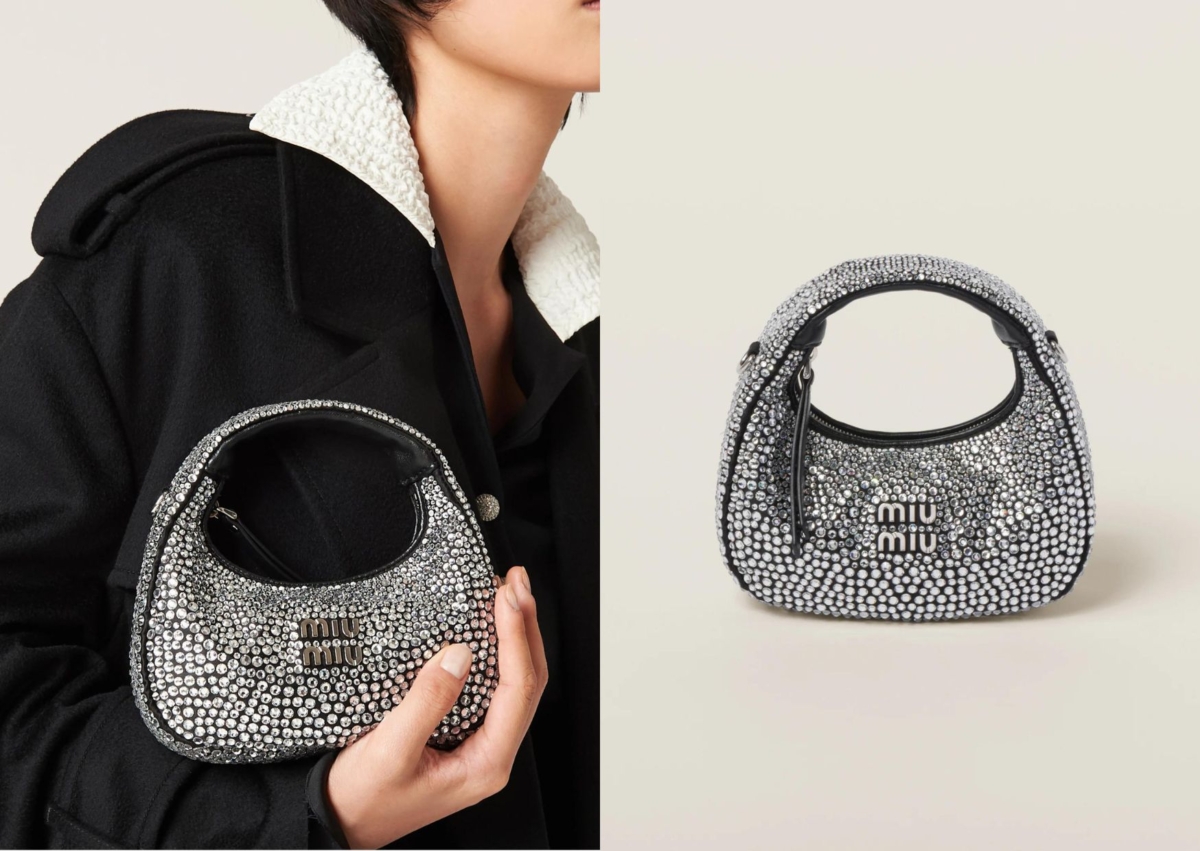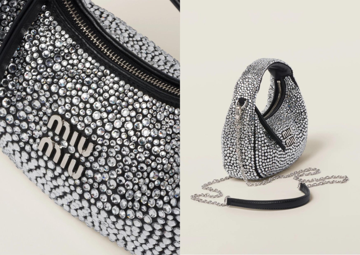 銀色精品包05:Miu Miu Wander 水晶絲質綢緞迷你半月形手袋,NT$ 89,000