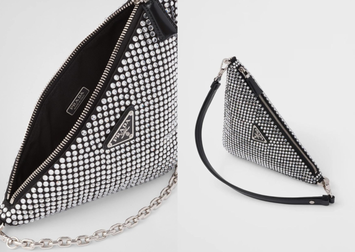 Prada 三角形一直是個很經典的品牌象徵,而這款綢緞三角肩背包以俐落線條重新展現經典造型,並綴滿象徵派對感的閃爍水晶,有鏈條和皮帶兩種背帶款式可交互替換,包身中間飾有搪瓷金屬三角形標誌,即使在華麗的氛圍下,也不失極簡格調,這款雖然是水晶但也是屬於中性款式,如果搭配得好,連男生揹起來也很時髦!