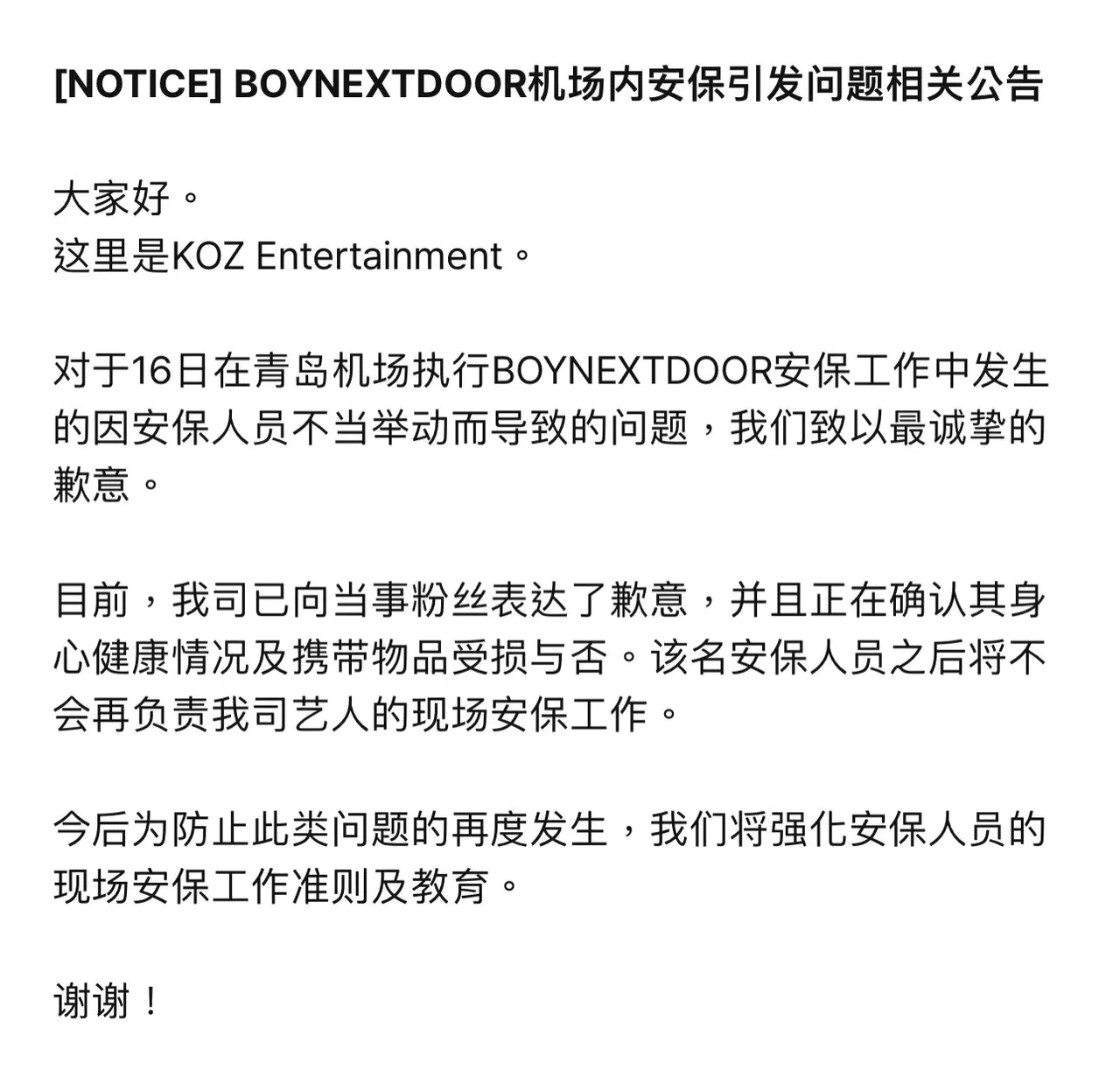 中國禁韓令逐漸解封,許多韓國團體也開始陸續在中國舉辦小型活動。HYBE旗下由ZICO創辦的KOZ娛樂所推出的新人男團「BOYNEXTDOOR」,也在12月16日舉辦青島粉絲簽售會。不過本來應該是開心與粉絲見面的時刻,卻慘變暴力憤怒事故。
