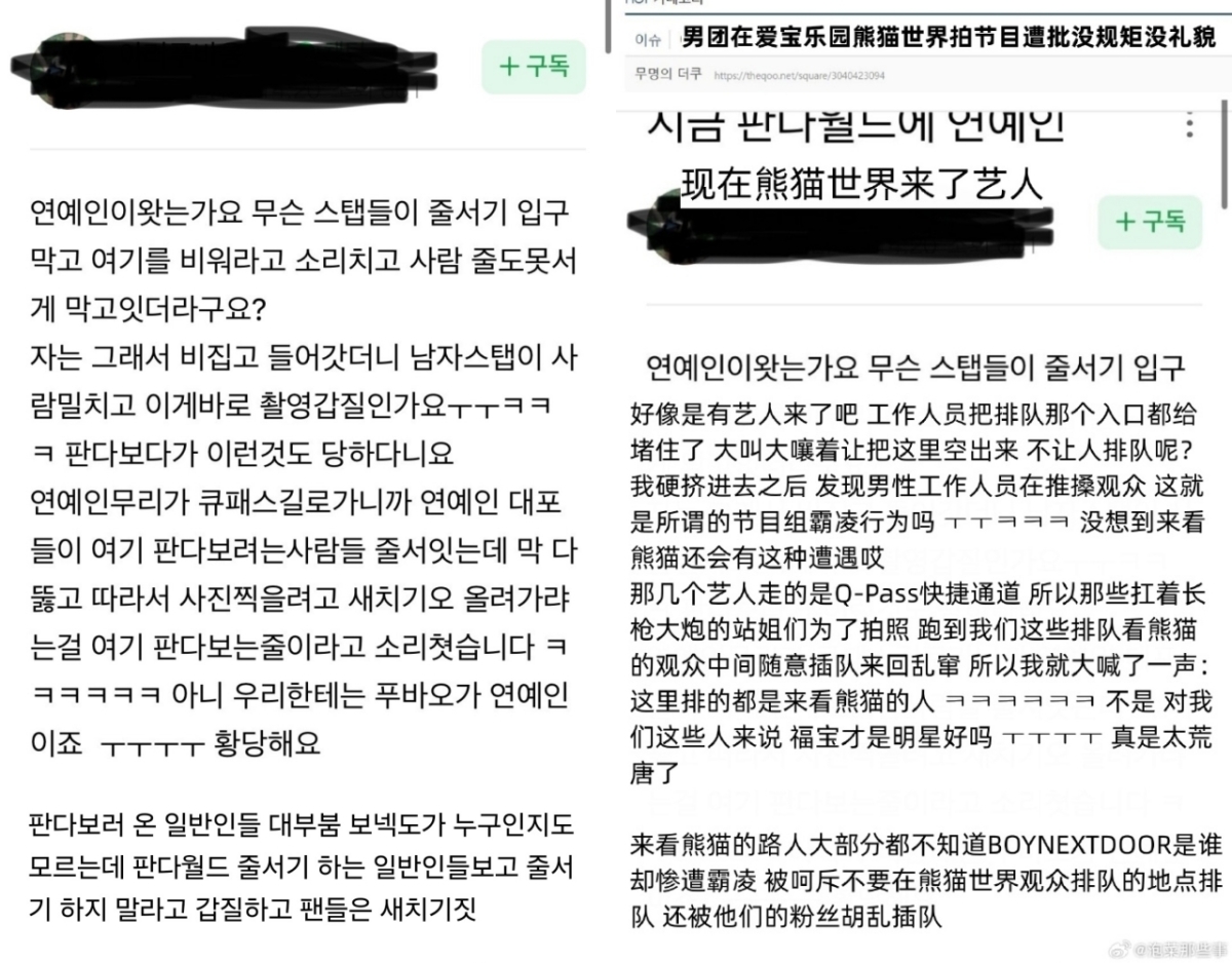 距離保鑣事件只過了2天,BOYNEXTDOOR又被爆料!18日一名遊客在論壇抱怨,當天去愛寶樂園的熊貓世界剛好碰到BOYNEXTDOOR拍攝節目,沒想到公司工作人員不但將入口堵住、推壓遊客,還有拿著大砲的粉絲們不斷插真正要看熊貓的隊伍,因此痛批,現場根本沒有人認識BOYNEXTDOOR,卻在這作威作福,並說對他們來說「福寶」才是明星。