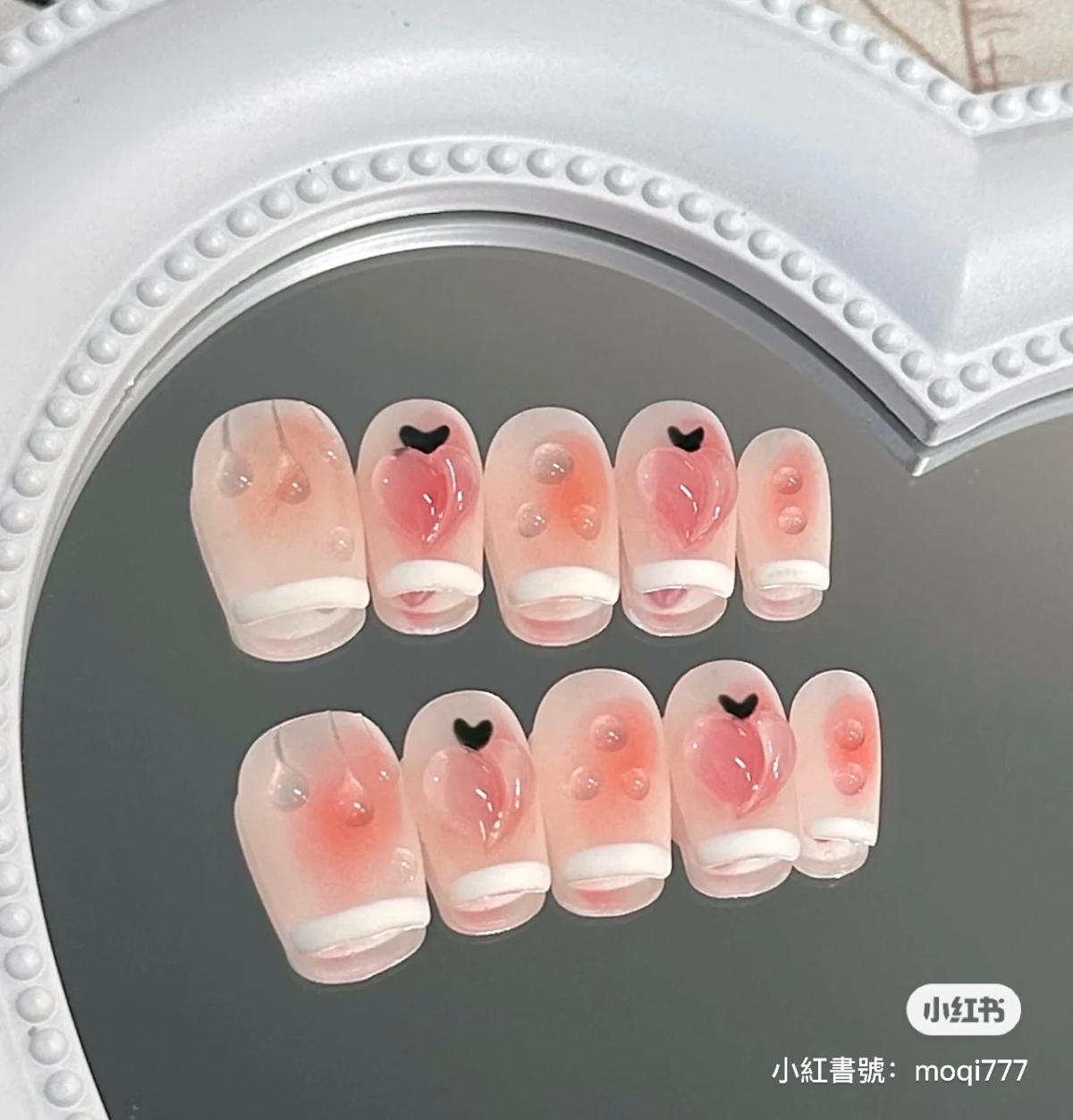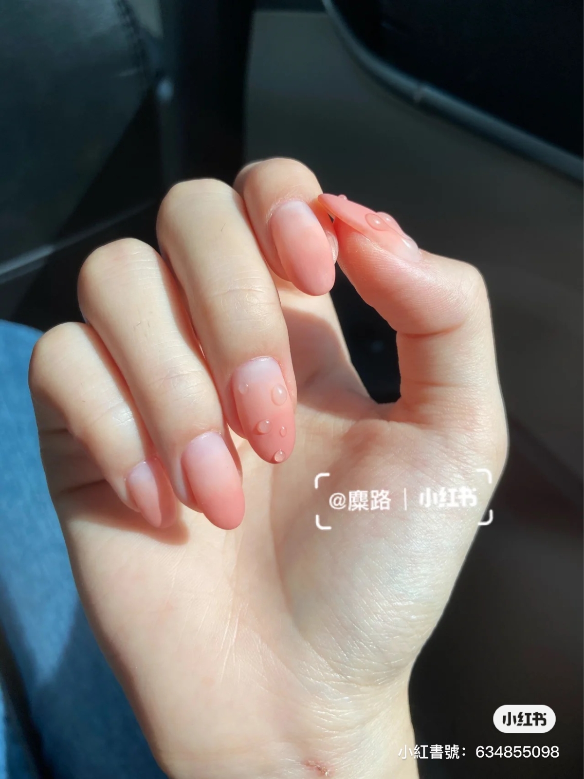 以淡雅的桃色腮紅美甲作為底色,並在甲面添加水滴造型的點綴,像是能掐出水的真實感,點綴在一指尖呈現出清透、優雅的效果。帶有一絲甜美的氛圍更呼應了2024年度代表色的熱潮。