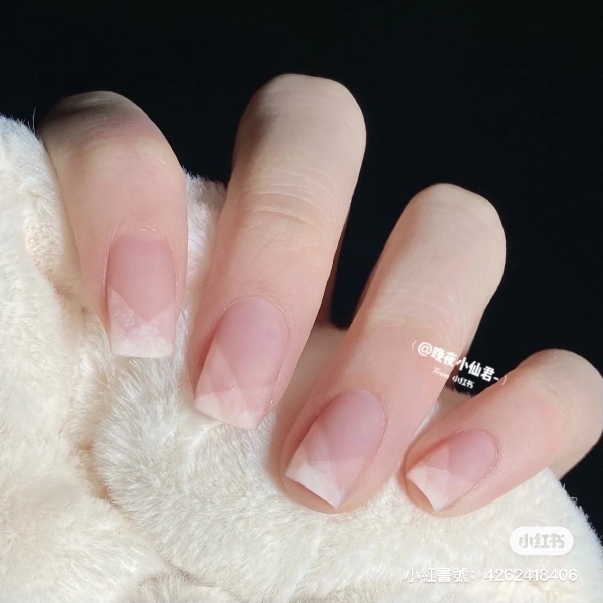 將桃色與經典的法式美甲結合,俐落的斜切線條不僅百搭,有別一般法式的單調更多了不同的趣味,打造出既浪漫又充滿現代感的美甲。而霧面質感也讓指甲更加精緻。