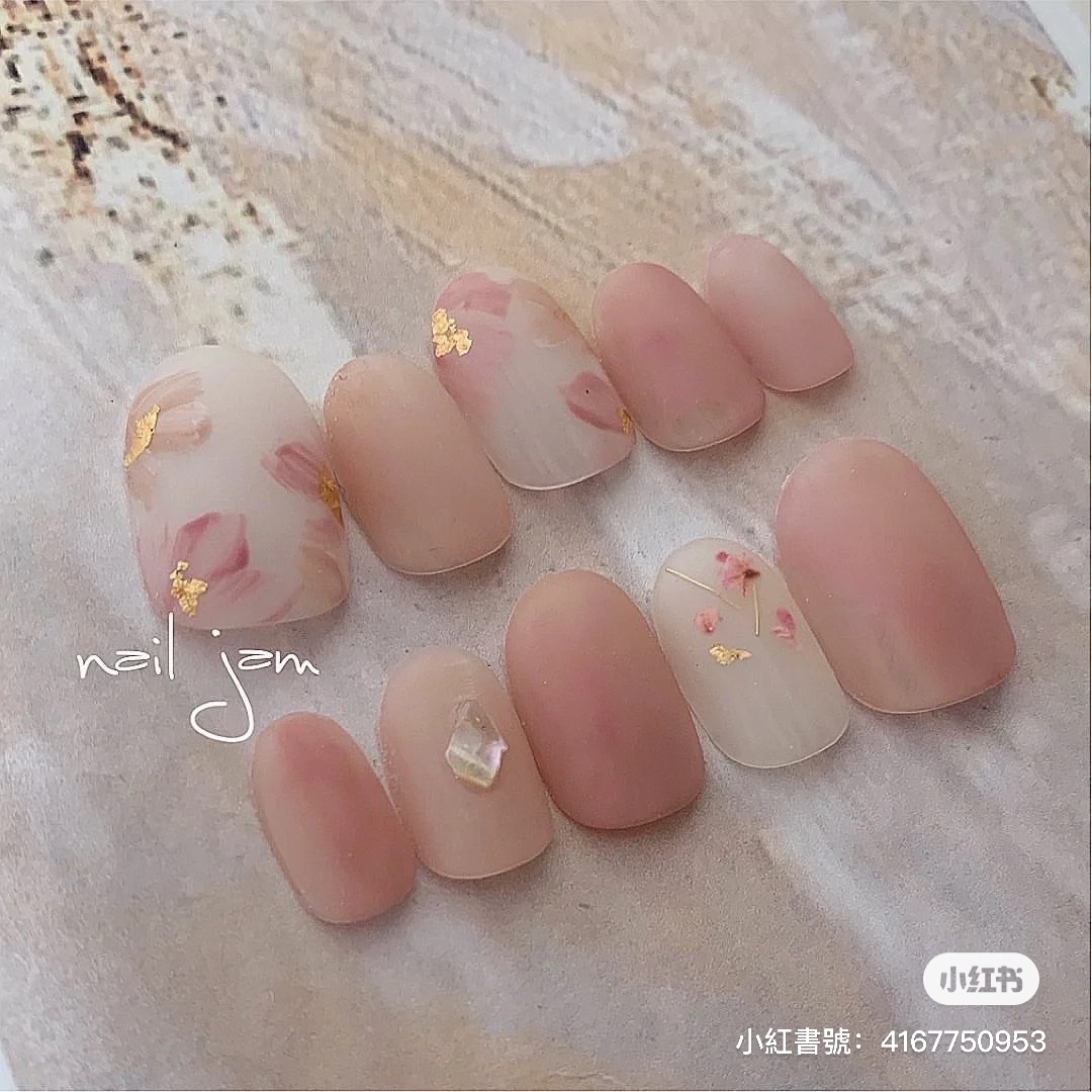 喜歡溫柔花卉設計的女孩也可以選擇搭配小花朵或是花瓣示意,以霧面的桃色和乳白色做為整體主色調,軟綿綿的感覺一秒化身人間水蜜桃♡建議可以挑選3-4個甲面畫出花朵,不要十指都佈滿彩繪留白的空間才能更凸顯重點,也可以再搭配金箔點綴更顯高級!柔美而時尚的質感,讓指尖充滿魅力!