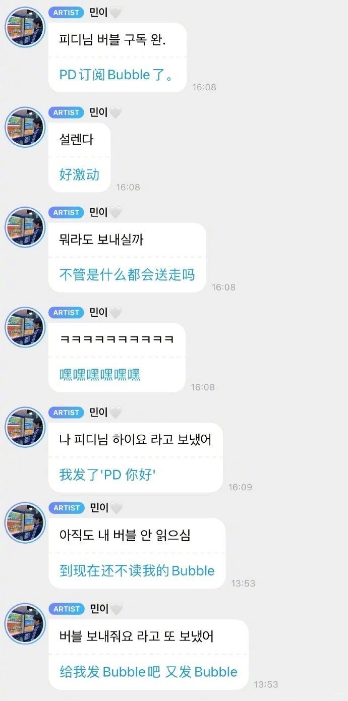 訂閱的偶像們也都有給朴軫永發消息,不但和粉絲們報告自己說了什麼,還感覺很期待會不會收到社長的回覆,甚至Straykids的昇玟還因為社長一直沒已讀他而鬧脾氣XD 大家的表現完全就和平常使用泡泡的粉絲一模一樣!