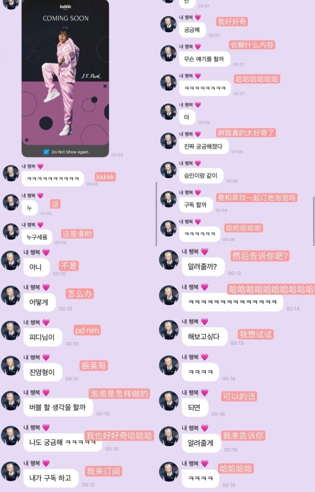 有在關注K-POP的粉絲都知道,朴軫永與自家JYP的偶像們都有不錯的關係,雙方也經常公開互動,旗下藝人們都常常開朴軫永玩笑,就在JYP偶像們看到自己的社長要開通泡泡後,覺得既荒謬又新奇,開始與自己的粉絲苦惱到底該不該買(笑)。