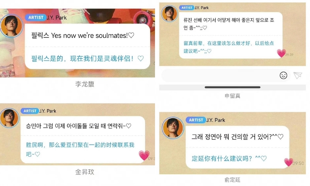 然而沒想到,朴軫永真的在泡泡中點名了有給他傳訊息的偶像們,一次性的連續回覆不僅讓畫面超級爆笑,與社長不符的偶像語氣和結尾可愛的表情符號更是讓粉絲看到快受不了,紛紛將聊天室內容分享出去,並說:「要瘋了畫風完全變了哈哈哈」、「這什麼家族聊天室嗎?ㄧ個個點名超好笑」、「朴軫永超偏心~都沒回覆我」、「笑死!沒想到定延竟然有訂閱太意外了」、「JYP是沒有每一團自己的聊天群組嗎,以後都透過這裡好了」、「朴軫永的泡泡很值欸,他每天都會看我的訊息」。