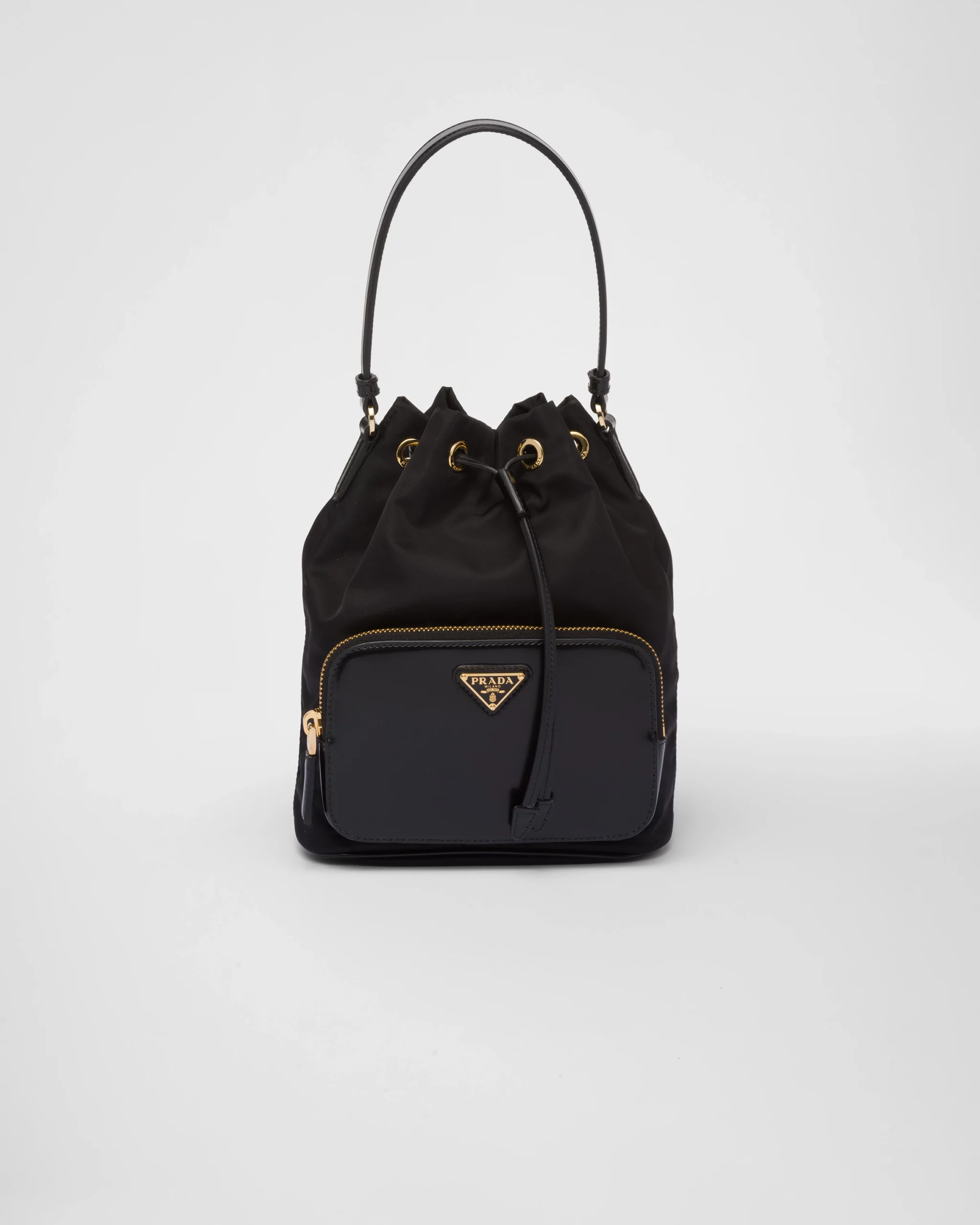 這款風格休閒的多功能水桶袋的外形柔和又時尚,可以手提或斜背方式搭配,設計結合創新再生尼龍面料 Re-Nylon 的實用性與精緻亮面皮革細節和金屬飾件,將傳統面料與創新結合,包身外設有拉鏈外袋,中間飾以搪瓷金屬三角標誌。