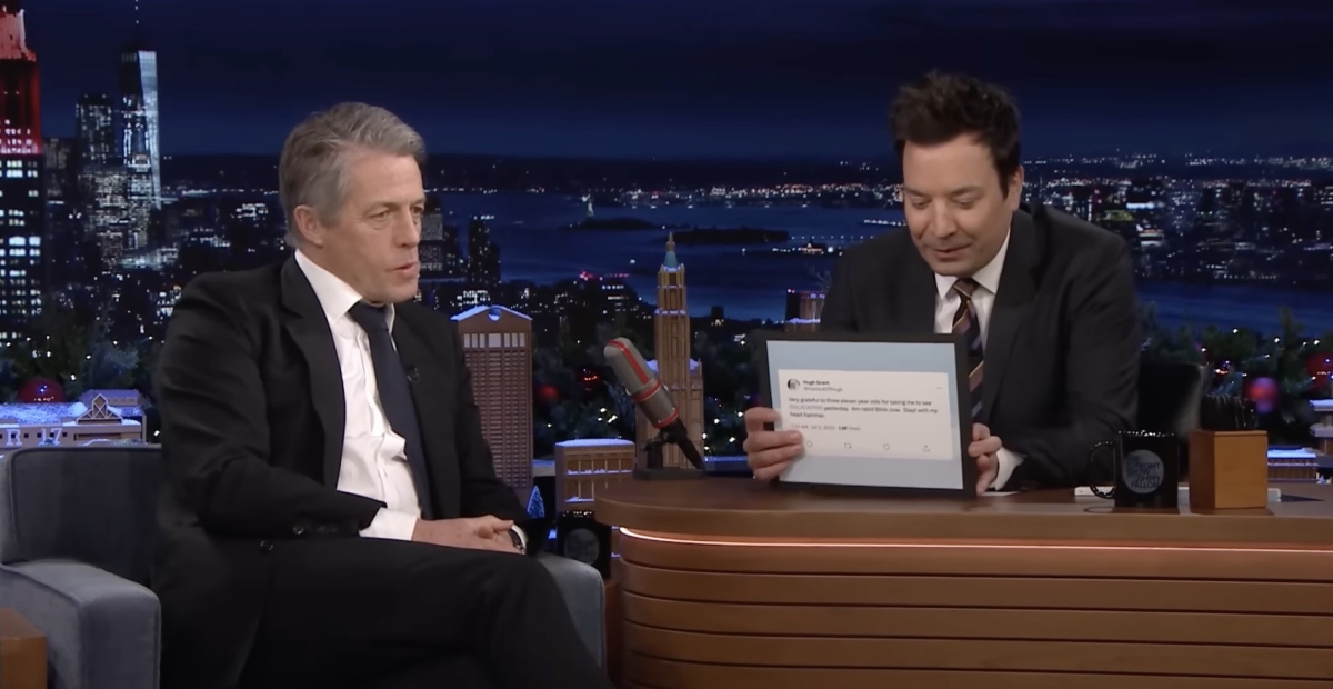 休葛蘭為了電影《旺卡》,參加美國談話節目《吉米A咖秀》進行宣傳,介紹電影之外也順便分享近期生活。而當主持人吉米在兩人聊天中,突然拿出一個有關休葛蘭在推特(X曾為Twitter)發表過的貼文,讓在場觀眾相當興奮。