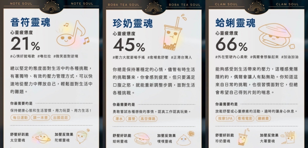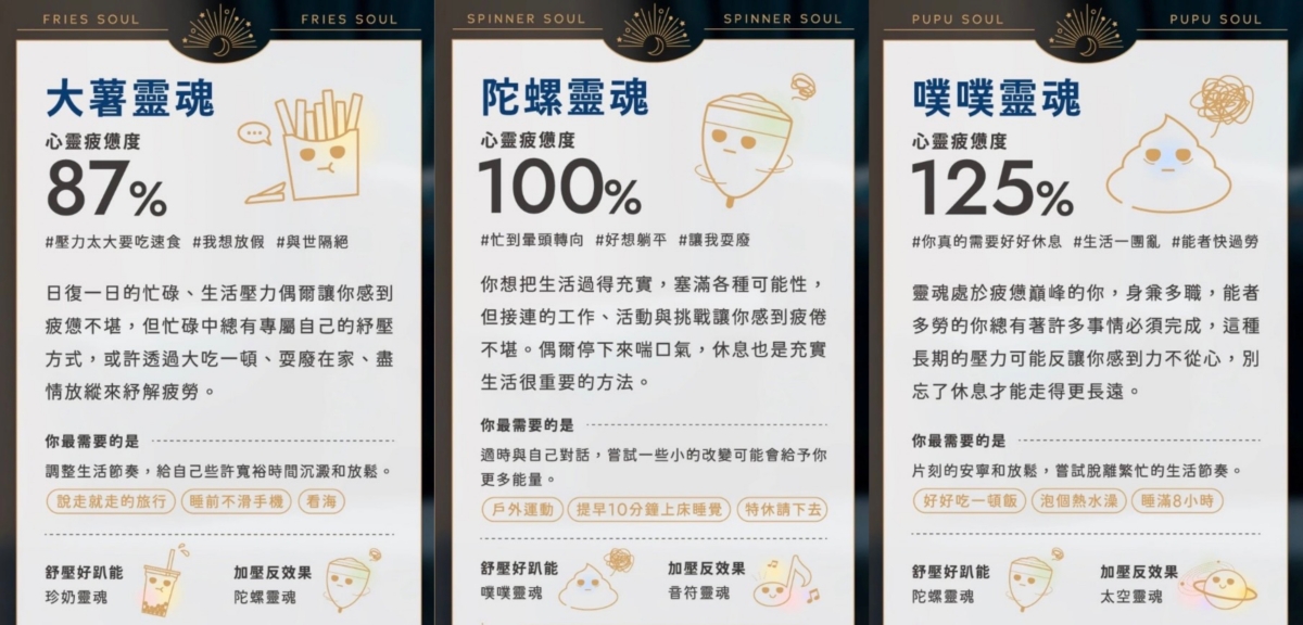 最後「慢下來聊癒所」會顯示出你屬於哪種靈魂喔!靈魂的結果內容包含「心靈疲憊程度」、「心靈Hashtag口頭禪」、「需要的建議」、適合一起舒壓和只會加壓的「靈魂夥伴」~