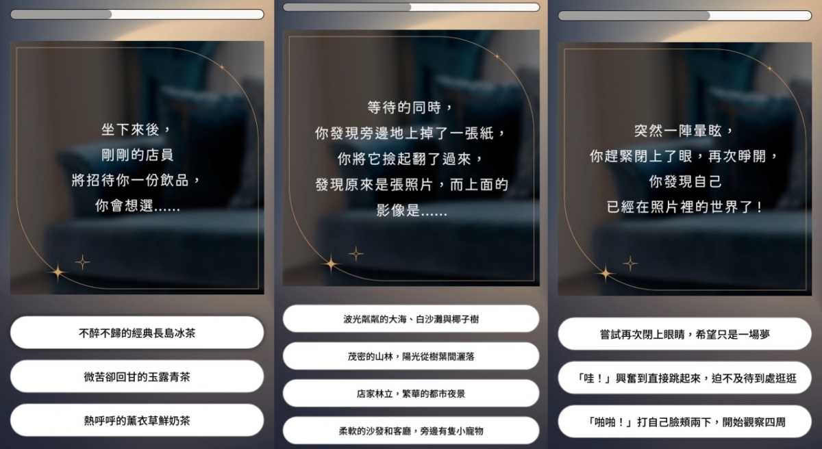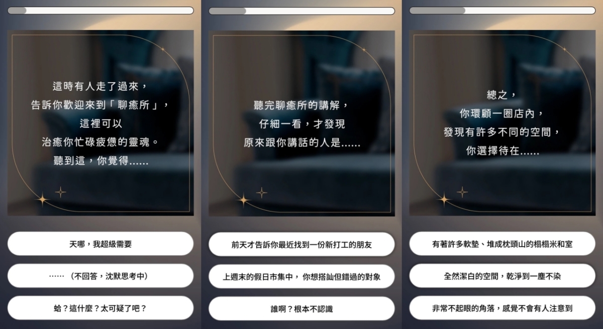 在測驗中,我們一頭霧水的進入神秘小店,發現竟然是幫助治癒靈魂的空間!接下來幻想與自己心靈談話的對象、座位、飲料,準備來場內心深層探索~