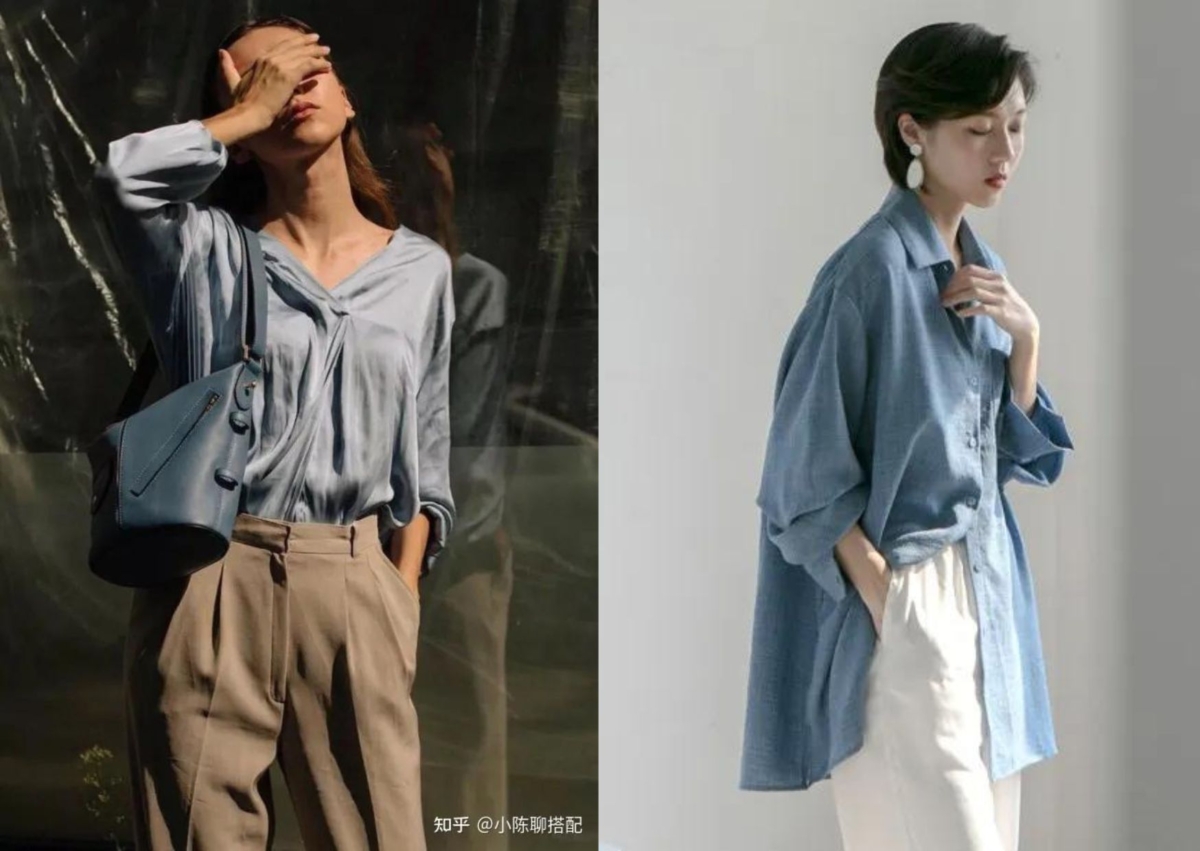 對於膚色不是屬於白皙的人來說,在穿搭的提亮上也要講究平衡原則,可以選擇較明亮、有醒目效果的顏色,比如白色、米色等。像是地有光澤感的霧霾藍襯衫搭配垂感的大地色寬褲,帶出莫蘭迪和大地顏色之間溫柔的碰撞,霧霾藍和白色是最容易搭配的,讓人感覺溫柔又清新的顏色,還有減齡、氣質和知性的特質!