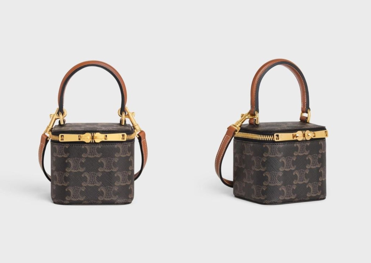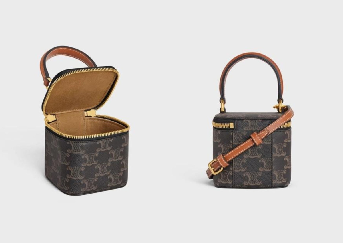 Celine 這顆 Triomphe 帆布及小牛皮迷你型化妝袋可以說是編輯私心最愛, 以 Triomphe 老花帆布作為包身設計,採用小牛皮製成,金色拉鍊飾邊和古銅色皮質提把超有質感,一樣可以掛肩、斜揹或手提,絕對是一顆回頭率極高的外型!