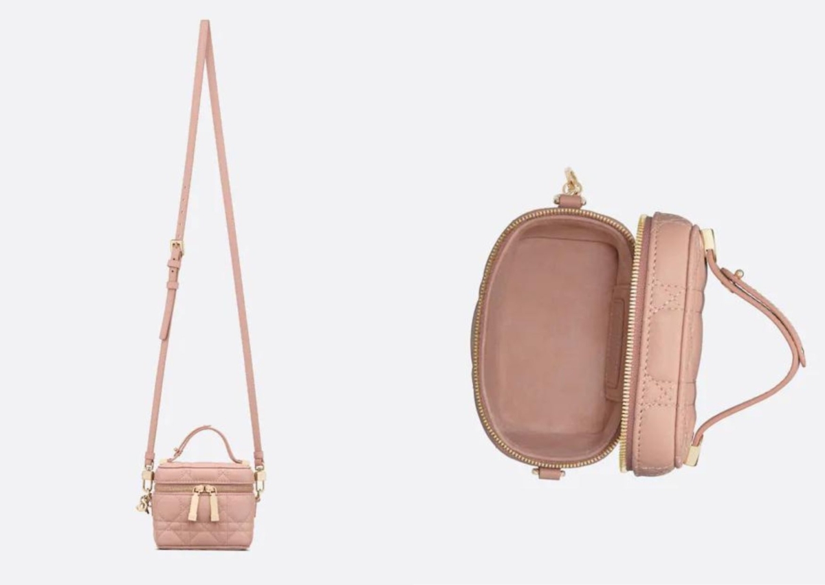 少女們最愛的 Lady Dior 本季推出微型款式,這顆Lady Dior 藤格紋圖案化妝袋採用 Rose Des Vents 羊皮製成,綴以 Cannage 藤格紋圖案縫線和 D.I.O.R. 吊飾,小巧可愛卻可以容納所有必需品,口紅、錢包和粉餅都放得下,可以輕鬆拎著手柄或是肩背、斜背都好看,粉嫩色調更充滿少女心!