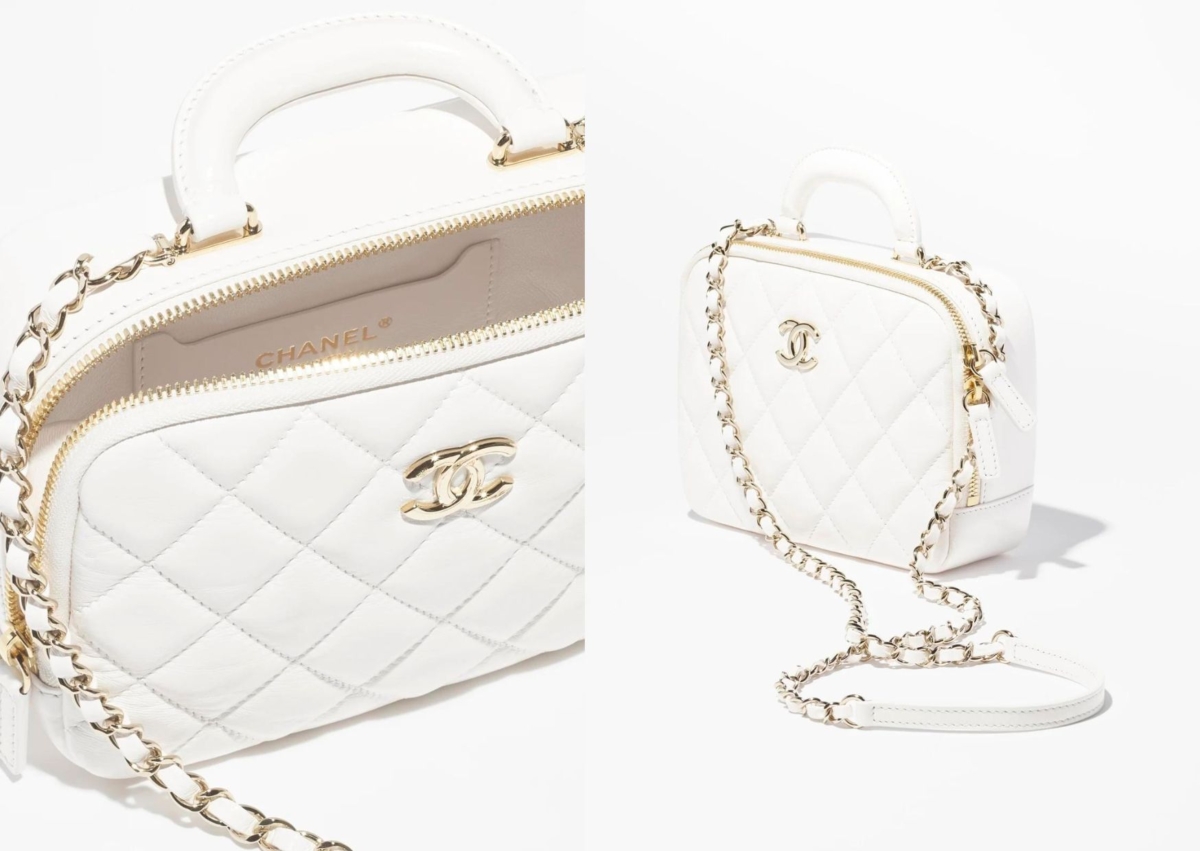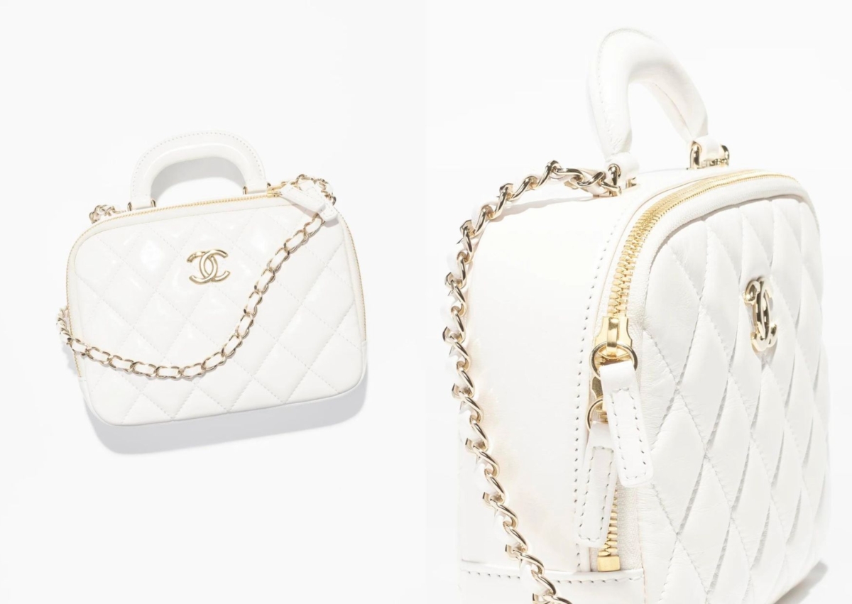 提到化妝箱包,絕對不能錯過小香!Chanel 幾乎每一季都會推出超可愛的化妝箱包和晚宴包,其中黑、白色款百搭又耐看,這顆 Chanel 金屬白小羊皮化妝包融入了 CHANEL 招牌菱格紋縫線、雙C標誌和金屬皮穿鏈帶,白色與金色相互呼應,手提可以很貴氣優雅,肩背則是多了份隨性可愛。