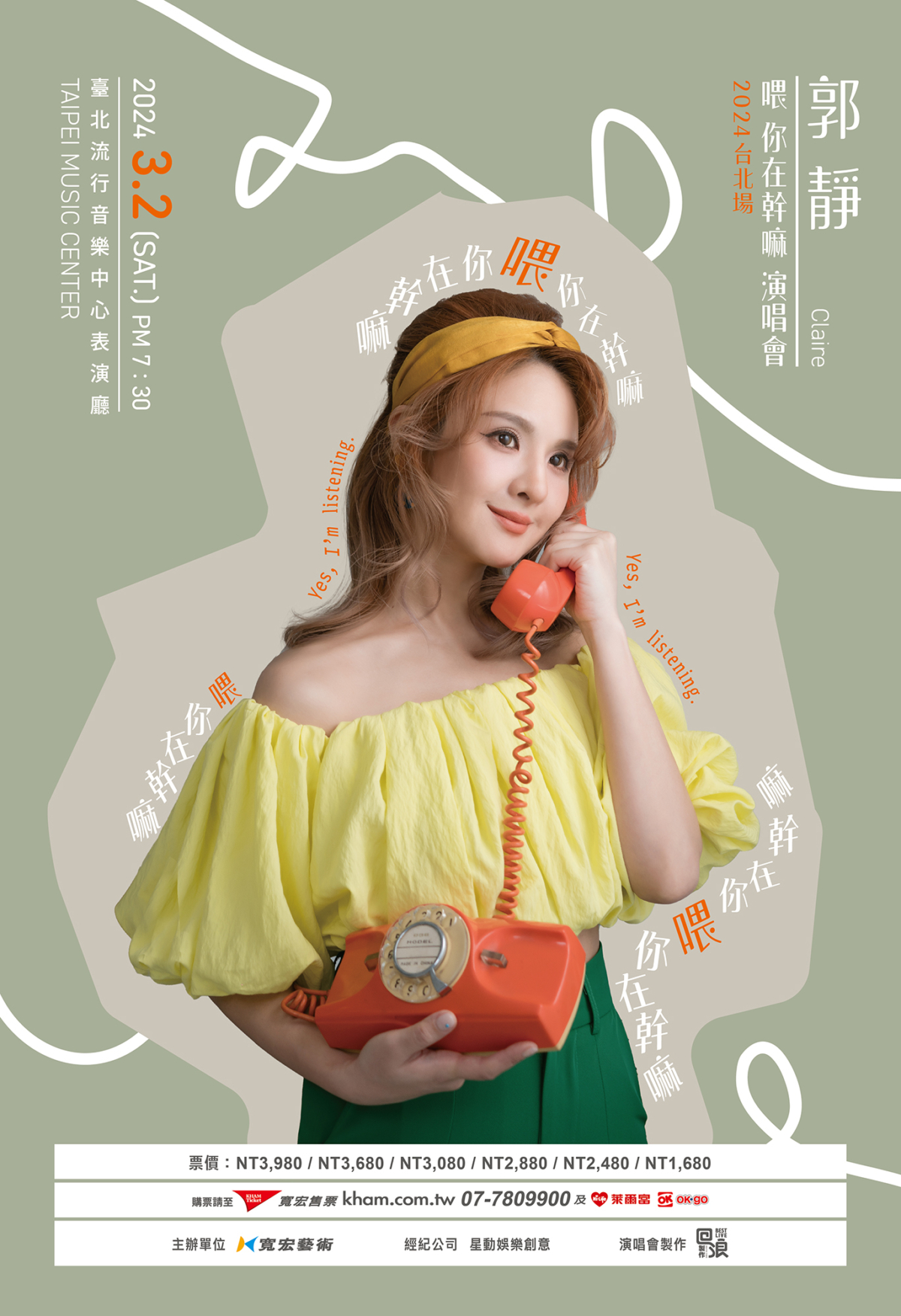 活動票價:A區 NTD 5,680 / B區 NTD 4,880 / C區 NTD 3,280 / 身障席 NTD 2,440 (E-mail購票) 全場對號坐席