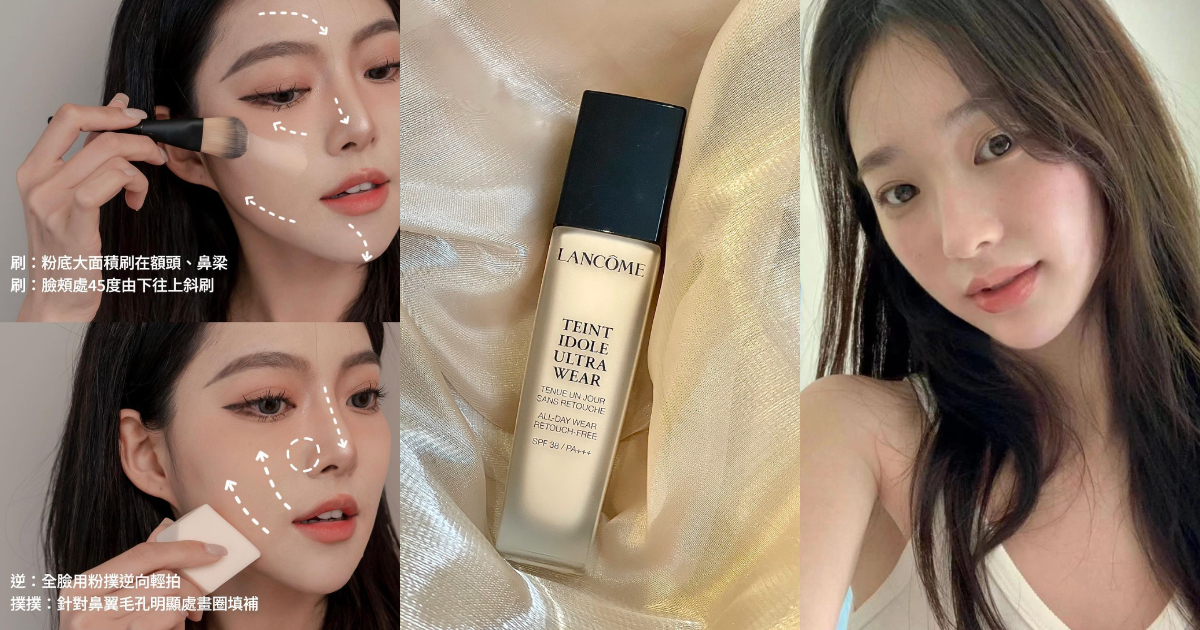 第一步先用指腹或粉底刷大面積逆著毛孔方向由上而下輕刷額頭、鼻樑,再以45度角由下而上斜刷兩頰及鼻翼,接著逆毛孔開口方向輕拍彈壓加強服貼度,最後照著同樣方向用沾濕後擰乾的「鑽石粉撲」由上而下輕拍彈壓額頭與鼻樑、再由下而上輕拍彈壓臉頰與鼻翼,尤其鼻翼兩側毛孔比較明顯可以再輕輕畫圓、用粉底液填滿凹洞,完妝效果保證服貼到尖叫!整張臉精緻無瑕甚至絕不脫妝!