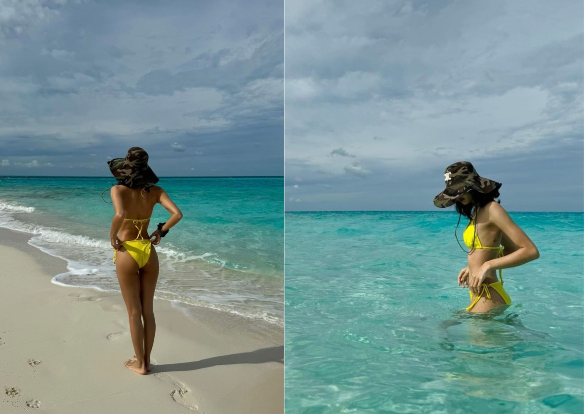 Lisa度假穿搭Look 01:亮黃色比基尼搭中性迷彩漁夫帽