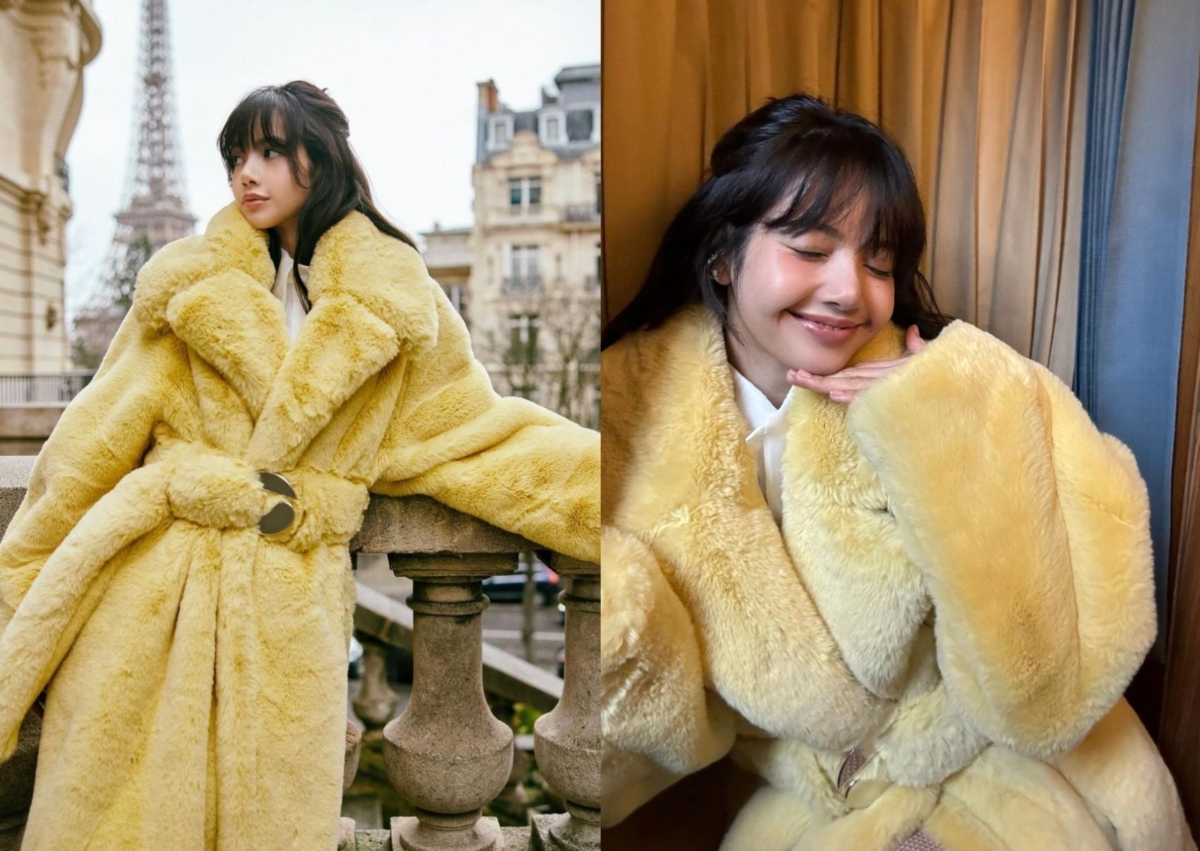Lisa MV 穿搭Look 06:黃色浮誇皮草大衣