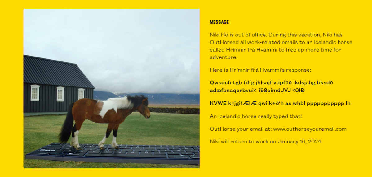 最後生產出來的信件會寫 :「現在並不是XXX(姓名)的工作時間,在度假期間,XXX將所有與工作相關的電子郵件發送給一匹名叫Hrímnir frá Hvammi(選擇的馬匹名字)的冰島馬負責,以便有更多時間繼續旅程。以下是Hrímnir frá Hvammi的回覆:『Qwsdcfrtgb fdfg jhlsajf vdpföð lkdsjahg bksdð adæfbnaqerbvui< i98oimdJVJ <0IÐ KVWE krjgi1ÆIÆ qwiik+ð‘h as whbl ppppppppppp lh(不同馬不同亂碼)』,這真的冰島馬所打出來的!發送電子郵件至: www.outhorseyouremail.com,XXX將於XXXX年XX月XX日回來工作。」荒謬到極致的內容讓你可以複製文字並儲存草稿,寄送給老闆讓他感到莫名其妙並知難而退(邪惡笑)。