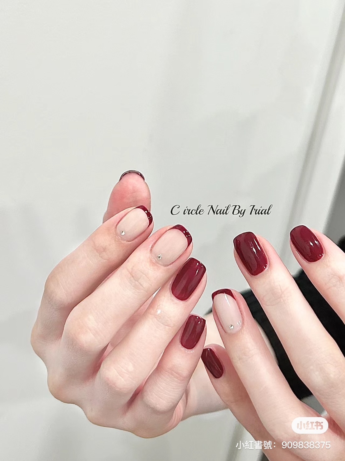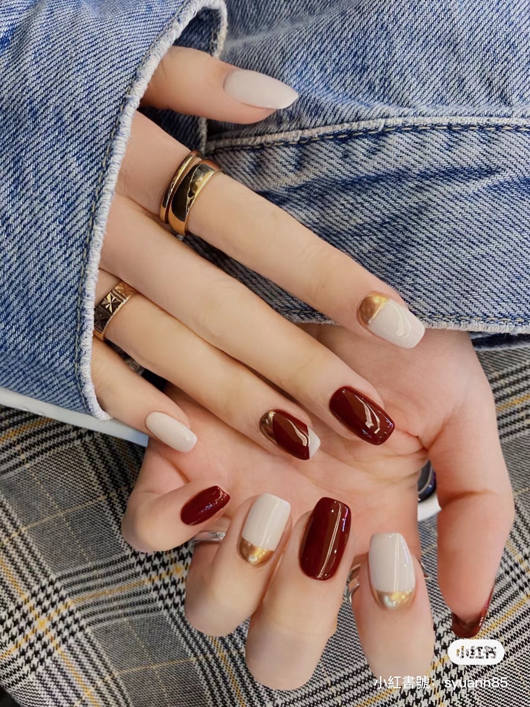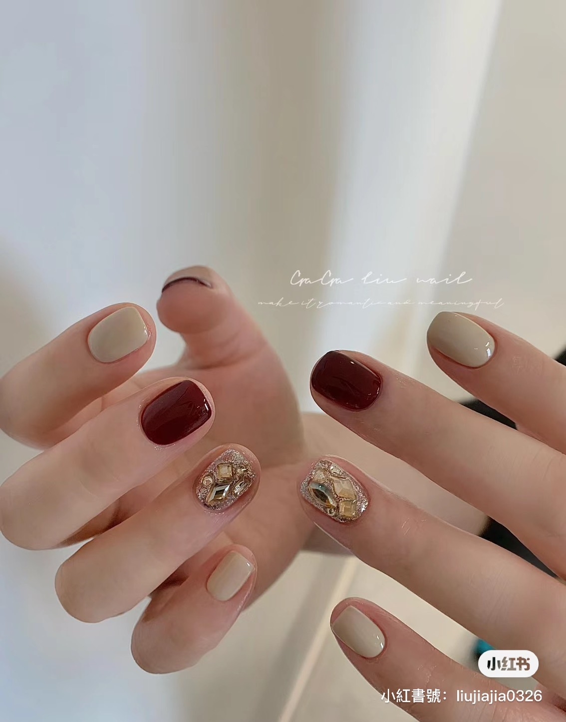 喜歡Bling Bling美甲的女孩可以嘗試用寶石元素搭配紅色來打造最華麗的新年美甲!以深沉的紅色為基調搭配大小不一的寶石點綴,細緻的光澤散發出一種高貴而獨特的節慶氛圍,除了以紅色為主角還能運用乳白色來豐富整體色彩,讓指尖更有層次感完全不會無聊!兼顧了日常感和奢華感,是一款超百搭的新年美甲唷~