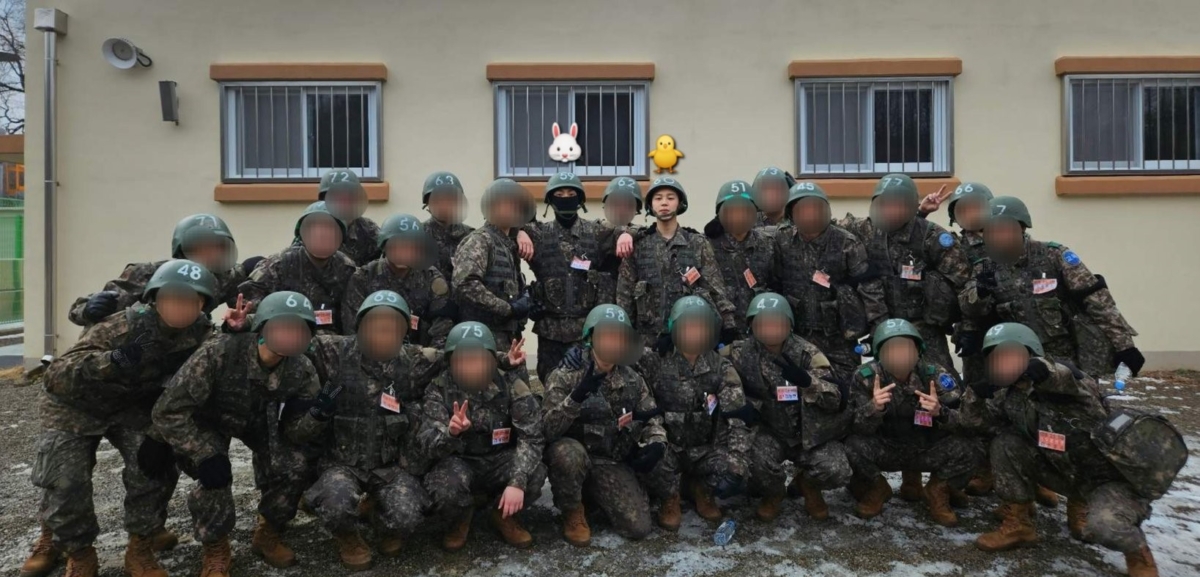 BTS於去年全員入伍,前陣子隊長RM與成員V的新兵訓練團體照曝光後,帥氣不減的模樣令粉絲讚嘆。近日,最後入伍的成員Jimin和忙內柾國,在軍中完成基礎訓練的團體合照也被流出,兩人站在隊伍的中間自然的模樣,看得出與同期新兵相處融洽。