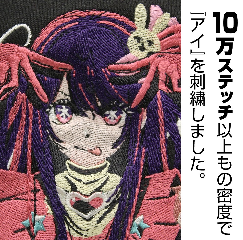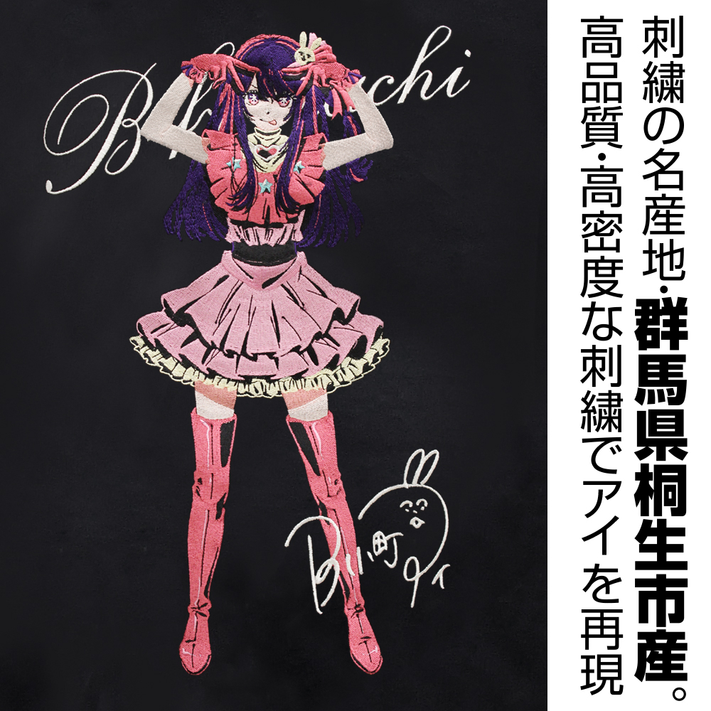 這件外套後面將《我推的孩子》漫畫第一本封面小愛的標誌型動作整個復刻下來,由群馬縣桐生市的匠人製作,並用10萬根針將小愛刺繡上去,根據線的方向製作出光澤和立體感,創造出密度超高、不留縫隙的細膩面部表情、頭髮流動和服裝的質感,再搭配深色材質外套,直接凸顯繽紛色彩的小愛!不管是顏色飽和還是線條明暗度都超清晰~且下面外套還有小愛的團體「B小町」的專屬簽名,像是真的簽名一樣好有收藏紀念價值♡