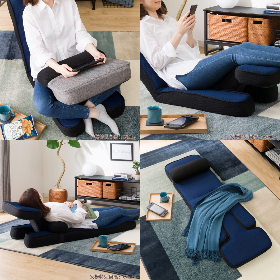 被稱作是「神人企劃」發明的「14段可調整式遊戲和式椅」,在日本是銷售第一的超人氣商品。這張椅子可以根據打電動、辦公、休憩不同需求做調整,使用附贈的止滑布套時可以當作簡易桌面靠著辦公或玩遊戲;放鬆坐著時可以跨上桌面舒服滑手機;想要休息小睡時,可以將整張椅子完全攤平並使用附贈的靠枕躺著,超多元用途怎麼會不熱賣!