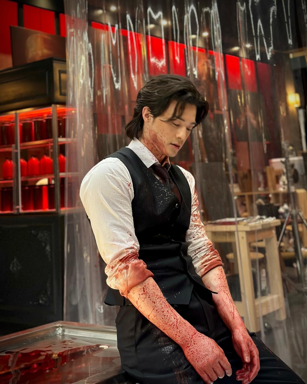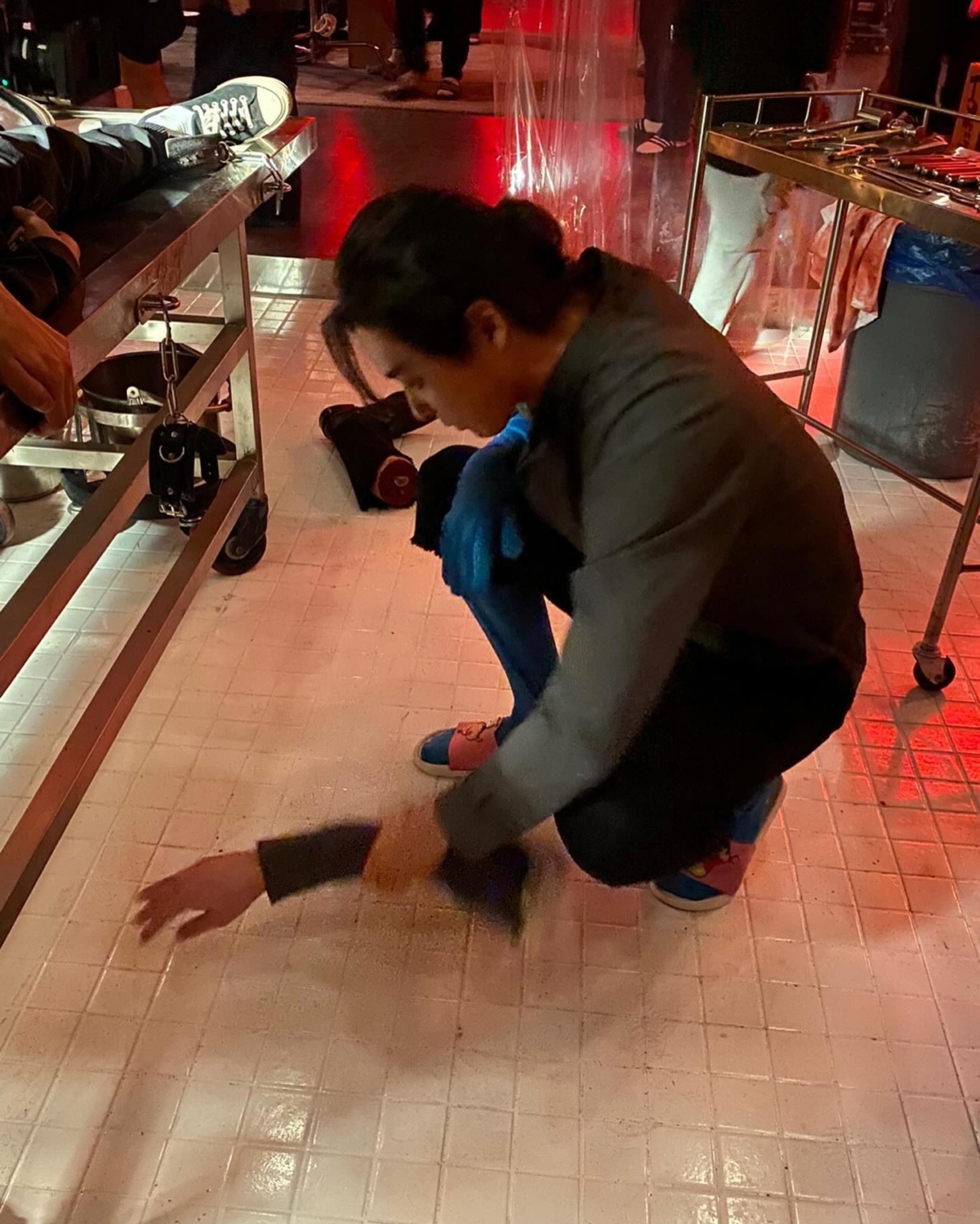 金智勳與金材昱後來在網上分享了這場戲的幕後照,兩人身上都血跡斑斑,卻依舊擋不住他們的顏值(?)。金智勳斜靠在手術台旁帥得像雕像,金材昱則把玩著斷肢道具,還性感地躺在手術台上~