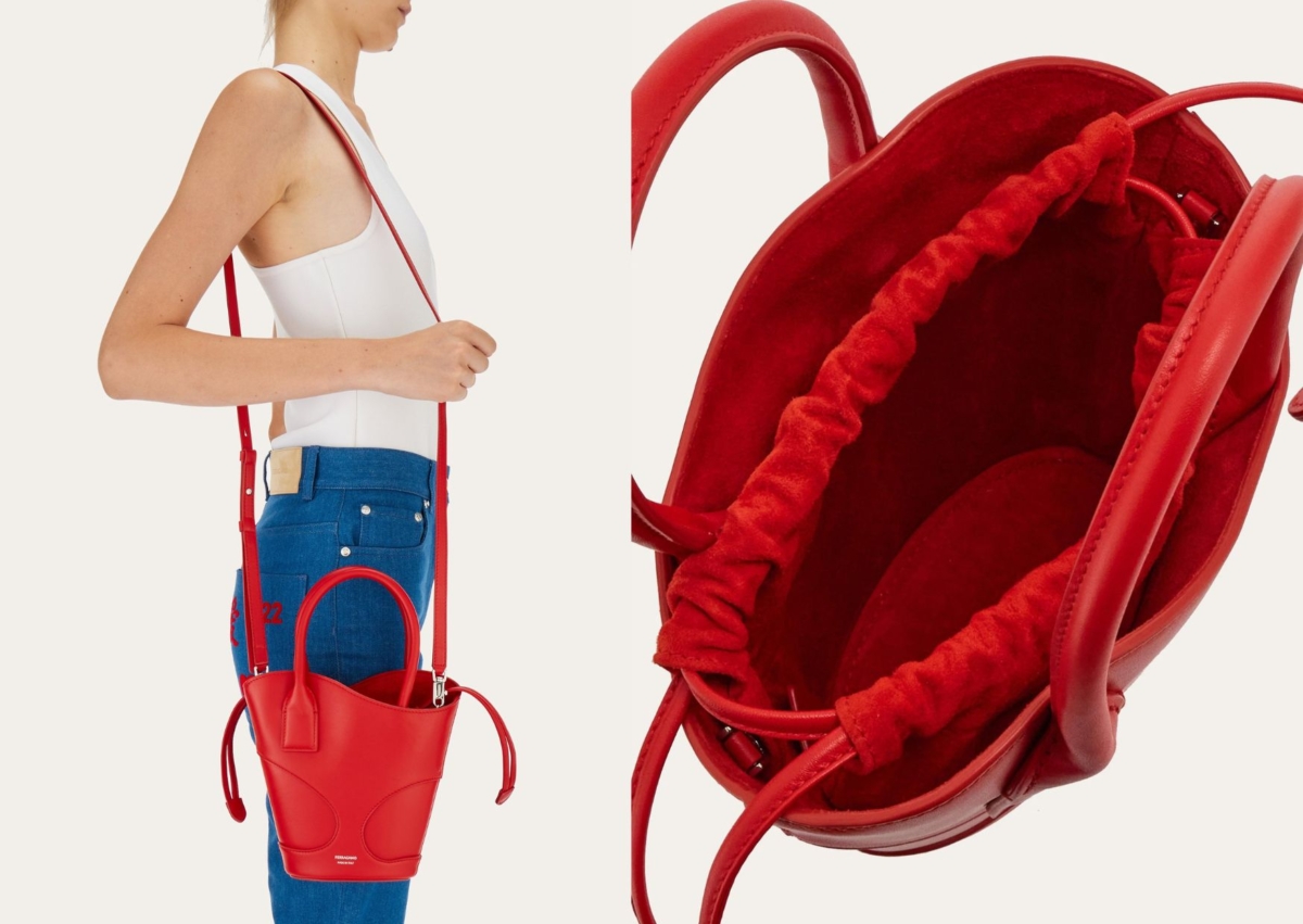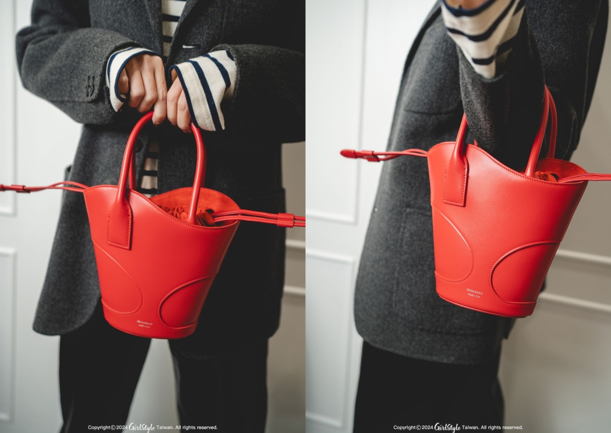 2024 早春問世的 FERRAGAMO Cut out 迷你皮革托特包,顧名思義採用挖洞剪裁手法,延伸單肩包的設計,轉變為擁有水桶外型的手提袋,硬挺的包型外觀時髦俐落,大開口的設計更好拿取物品,內搭麂皮束口袋。