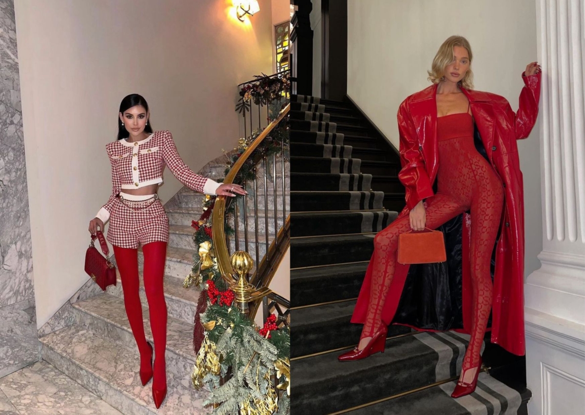 本來就偏好浮誇式穿搭的女孩們可以大膽嘗試紅色上衣搭配紅色絲襪的穿搭,像是 Elsa Hosk 就以紅色皮革外套內搭紅色蕾絲連身褲、紅色高跟鞋和紅色手拿包,金色隨性短髮更呼應了歐美感造型,一身超有氣勢又小露性感的全身紅的造型,過年穿出門絕對回頭率百分百!