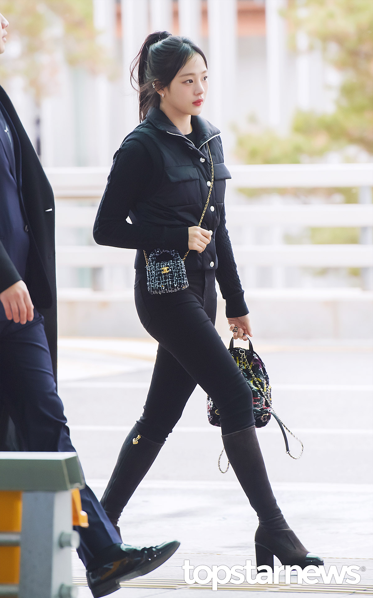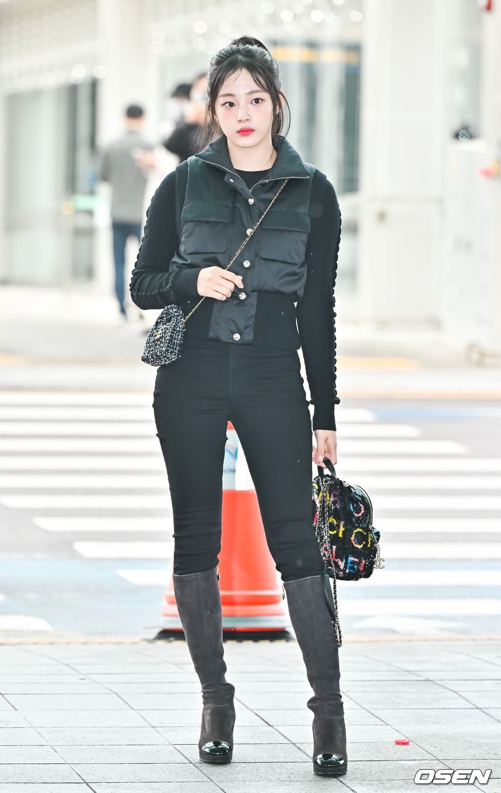當天即將出發的Minji一現身仁川機場立刻引起驚呼聲!Minji身穿黑色針織毛衣、背心、緊身褲和靴子,搭配側背Chanel針織毛呢包與手拿Chanel色彩亮片小後背包登場,輕便簡約的穿搭顯得Minji俐落霸氣外,更顯現出Minji 169公分的大長腿,修長的身材讓粉絲與網友都忍不住讚嘆。