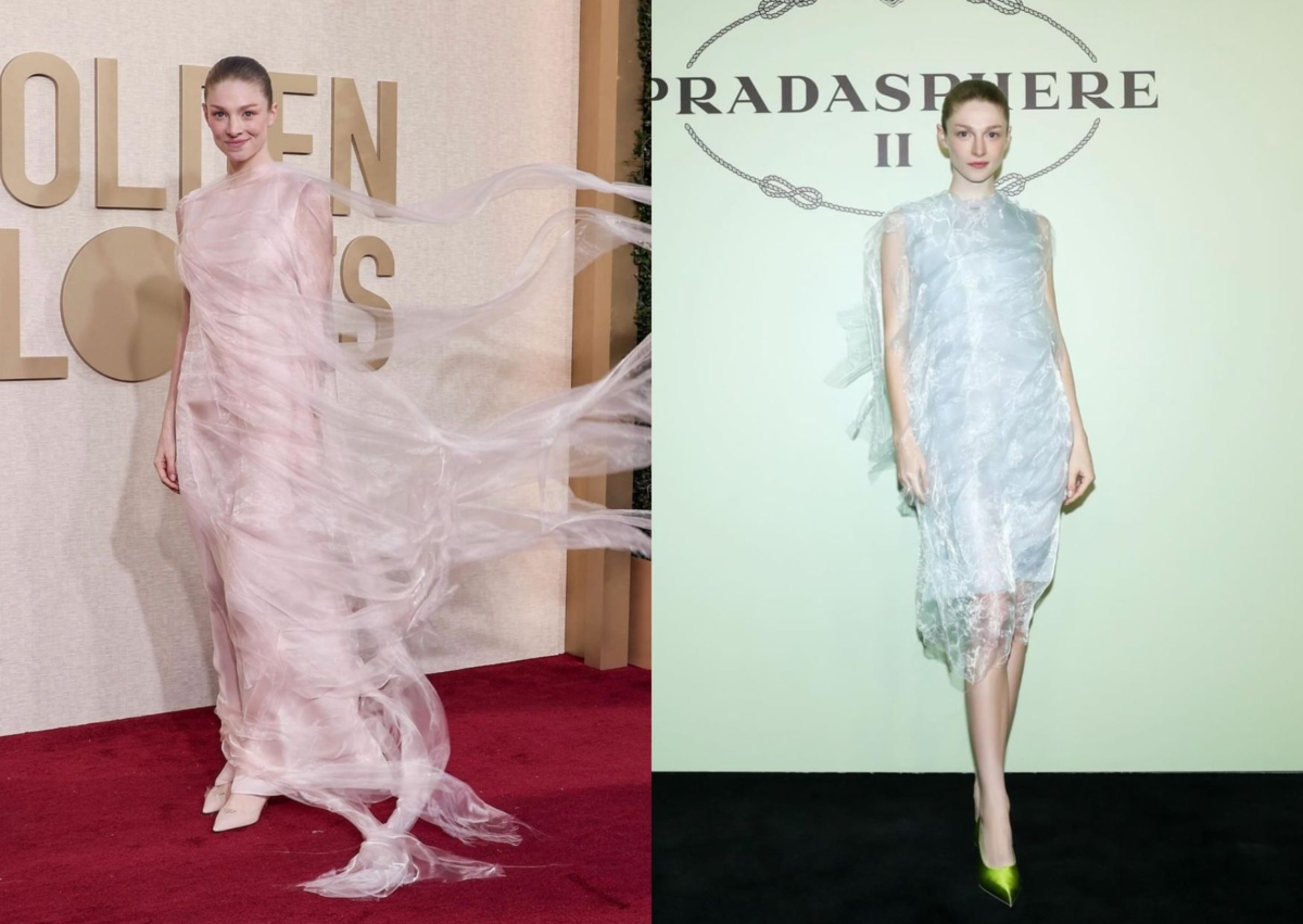 從日常到時尚,2024 年的整體氛圍都將圍繞著「水母樣貌」,所謂水母一詞就是指服裝或配件等受到柔軟、蓬鬆、飄逸、夢幻和具有光澤感的影響,像是帶有豐富層次的水母穿搭,在本屆金球獎上這位跨性別模特兒 Hunter Schafer 正帶來話題性,穿著 Prada 白色飄逸層次長禮服,恰好一陣風吹過,服裝細節順勢飄起,呈現如水母般的輕盈透徹姿態!
