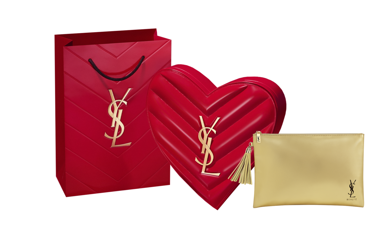 單筆消費滿NT$12,000元(含任一香水單品),即贈情人節限定心型禮盒、情人節限定大提袋與YSL訂製金色手拿包!