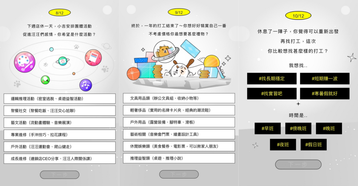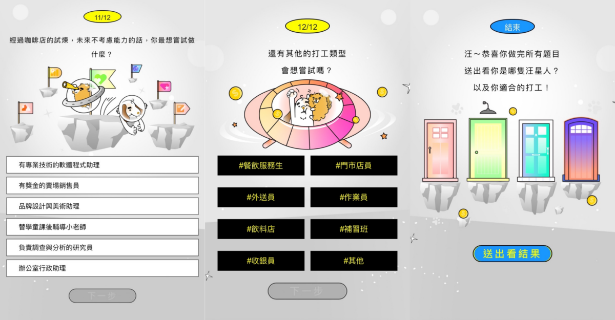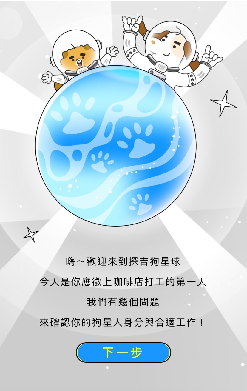 想像你現在來到了狗狗星球,為了生活必需打工,在面試成功後第一天在咖啡廳打工,但老闆還是想再多了解你是否適合這份工作,跟著情境回答符合自己做事的答案與真實的想法。
