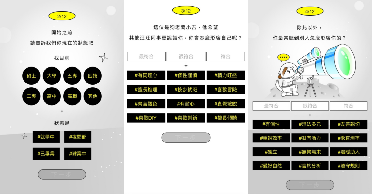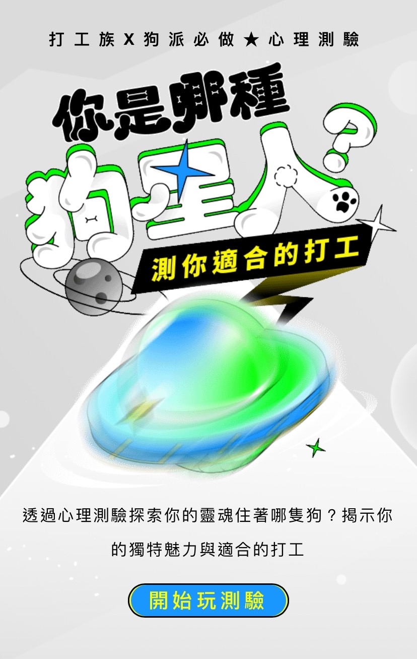 「你是哪種狗星人」顧名思義就是測出自己是哪種類型的狗狗,不僅如此,這款心理測驗也非常適合還在找工作或是一般的大學生,因為測驗內容有探索內心的靈魂外,還有包含分析自己適合什麼樣的打工喔!