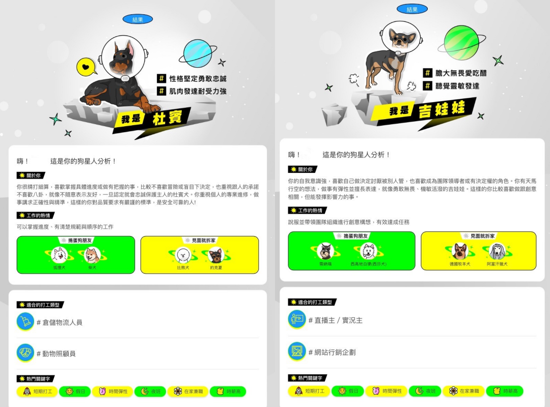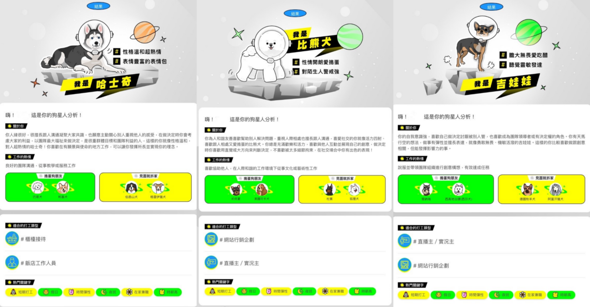 所有問題都一一回答完後,登愣~你的狗星人分析結果就出來啦~不但有超準的狗狗標籤,還有關於你的詳細性格說明與工作態度,與自己相處得來的狗朋友!除此之外,根據以上情境應對、想要的工作要求,系統也會幫你自動找出適合你的打工喔~需要看看建議的朋友都可以測測看♡