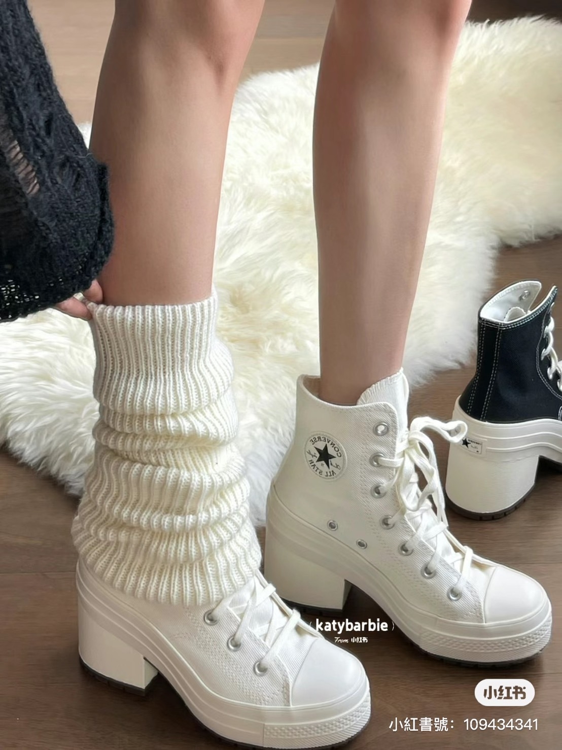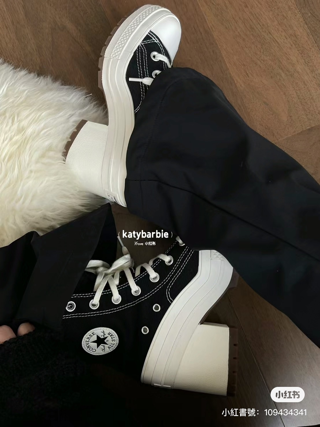 當帆布鞋變成高跟鞋,究竟要怎麼搭~CONVERSE DE LUXE HEEL復古粗跟鞋在小紅書上很多網友討論,因為實在太顯高顯瘦啦!跟高足足有9公分,搭配落地長褲能巧妙增高,但搭配裙裝也是優雅可愛兼具,網友還說「第一眼醜、第二眼還行,第三眼誰都不要跟我搶~」