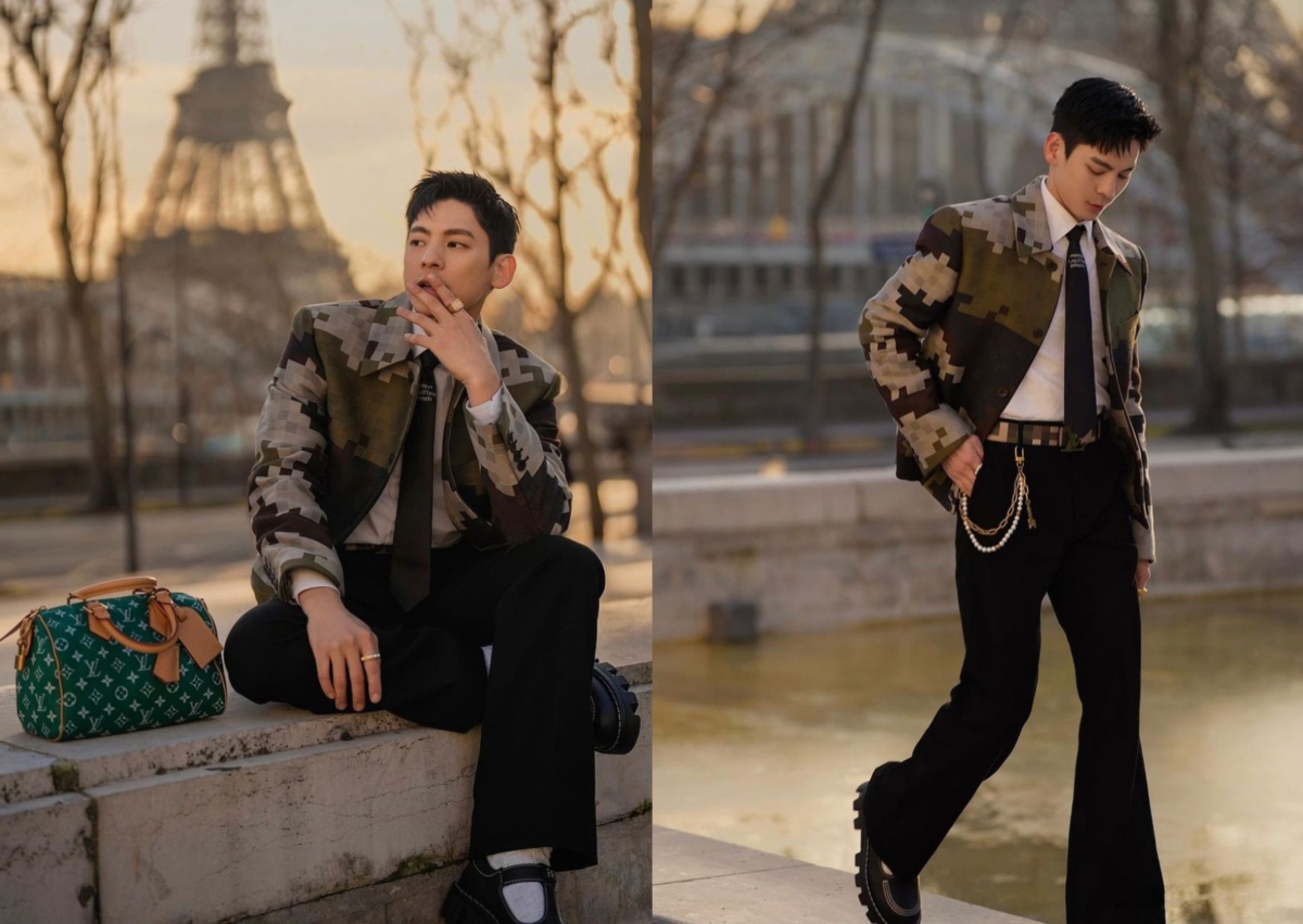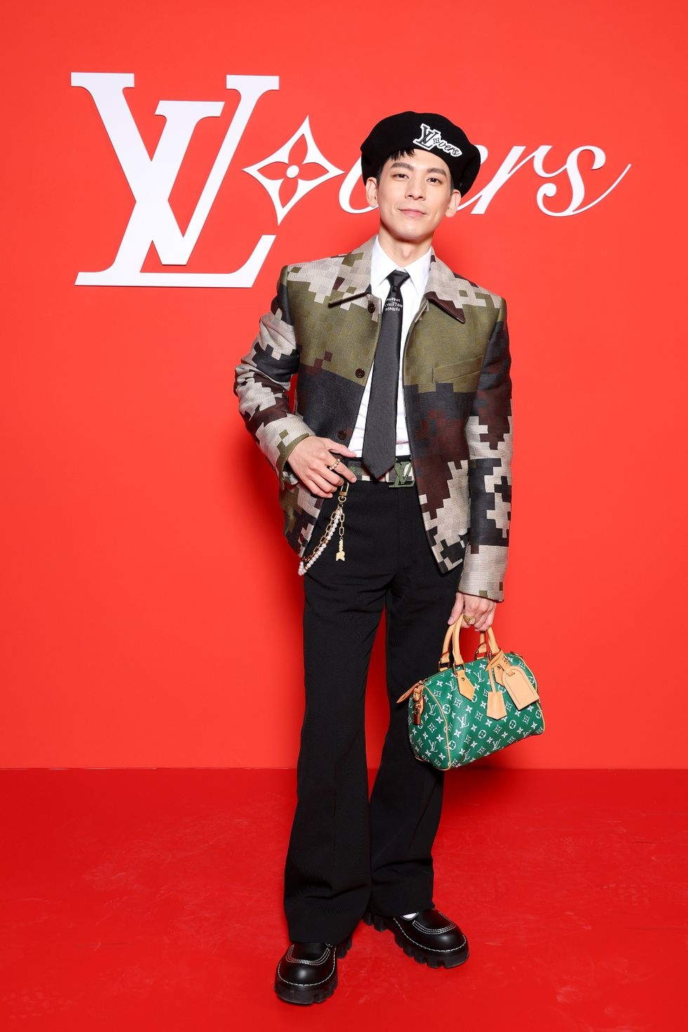 林柏宏當然也來到 Louis Vuitton 時裝周啦!穿上一身迷彩色的經典棋盤格紋西裝,搭配白色襯衫和黑領帶,戴上印有 LVers Logo 的貝雷帽,連皮帶都是軍綠色小細節,微微喇叭型的褲子拉長身材比例,手上熱賣的 Speedy P9 鮮綠色手提包也是一大重點。
