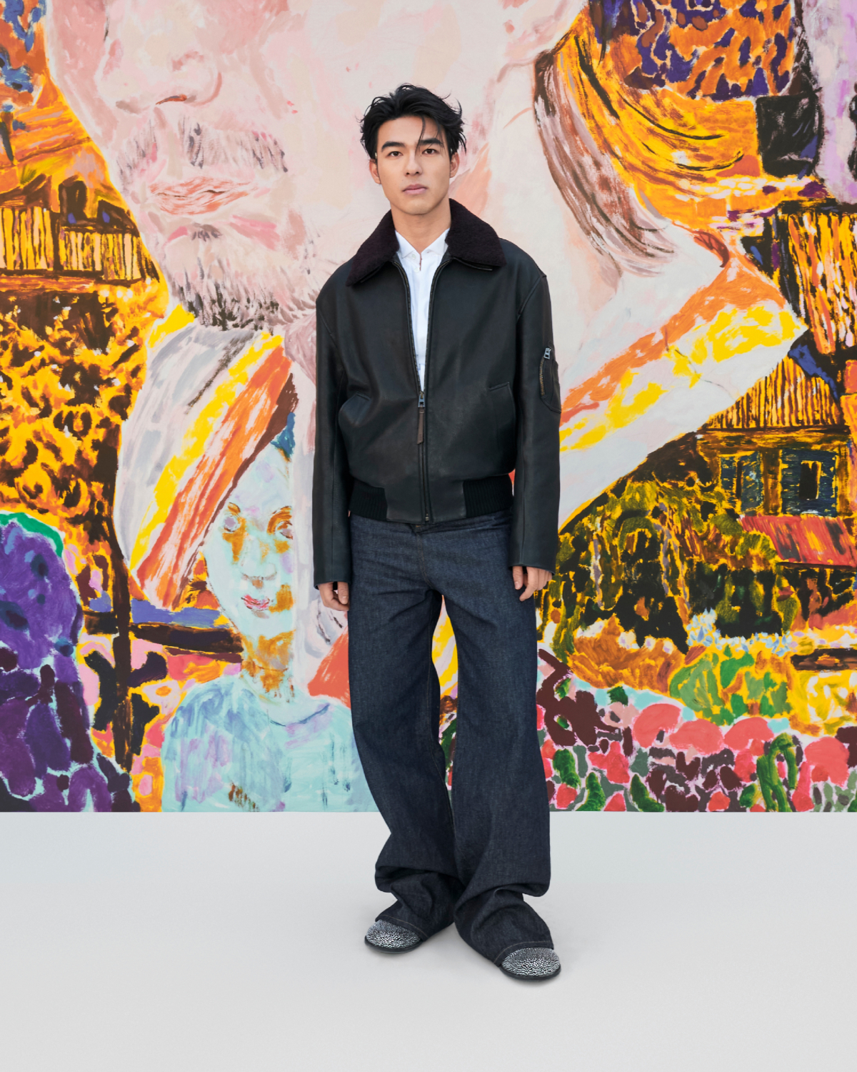 陳昊森首度來到巴黎參與 Loewe 2024 男裝大秀!選擇白色襯衫的配翻領式黑色夾克,下身穿著深色丹寧褲,褲長有著小精心設計,刻意拉長比例營造復古時髦感,瀟灑不羈的髮型呼應整身穿搭,在色彩繽紛的背板中更顯得反差強烈。