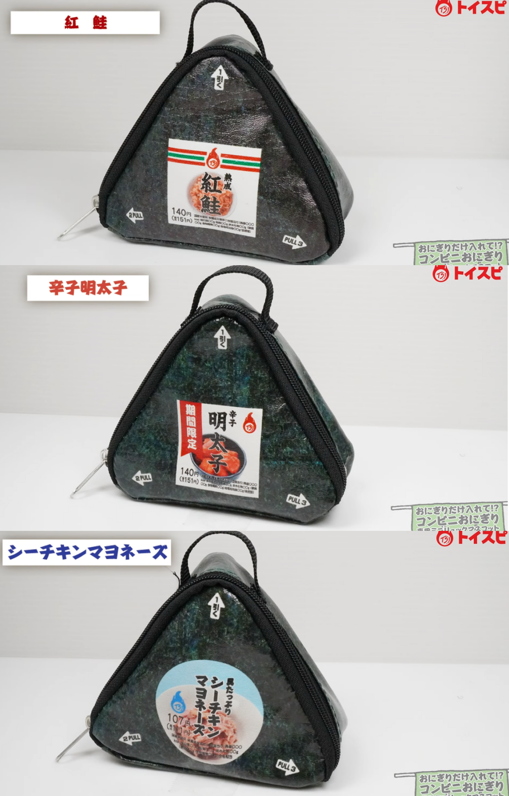 而且背袋的外的造型也設計成實際御飯糰的模樣,海苔+標籤貼超可愛♡三角飯糰總共有3款口味包裝,紅鮭魚、明太子與雞肉美乃滋。