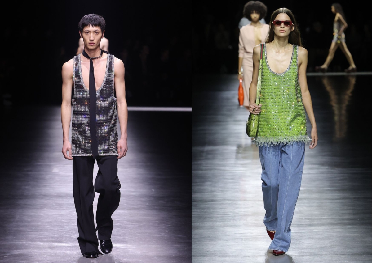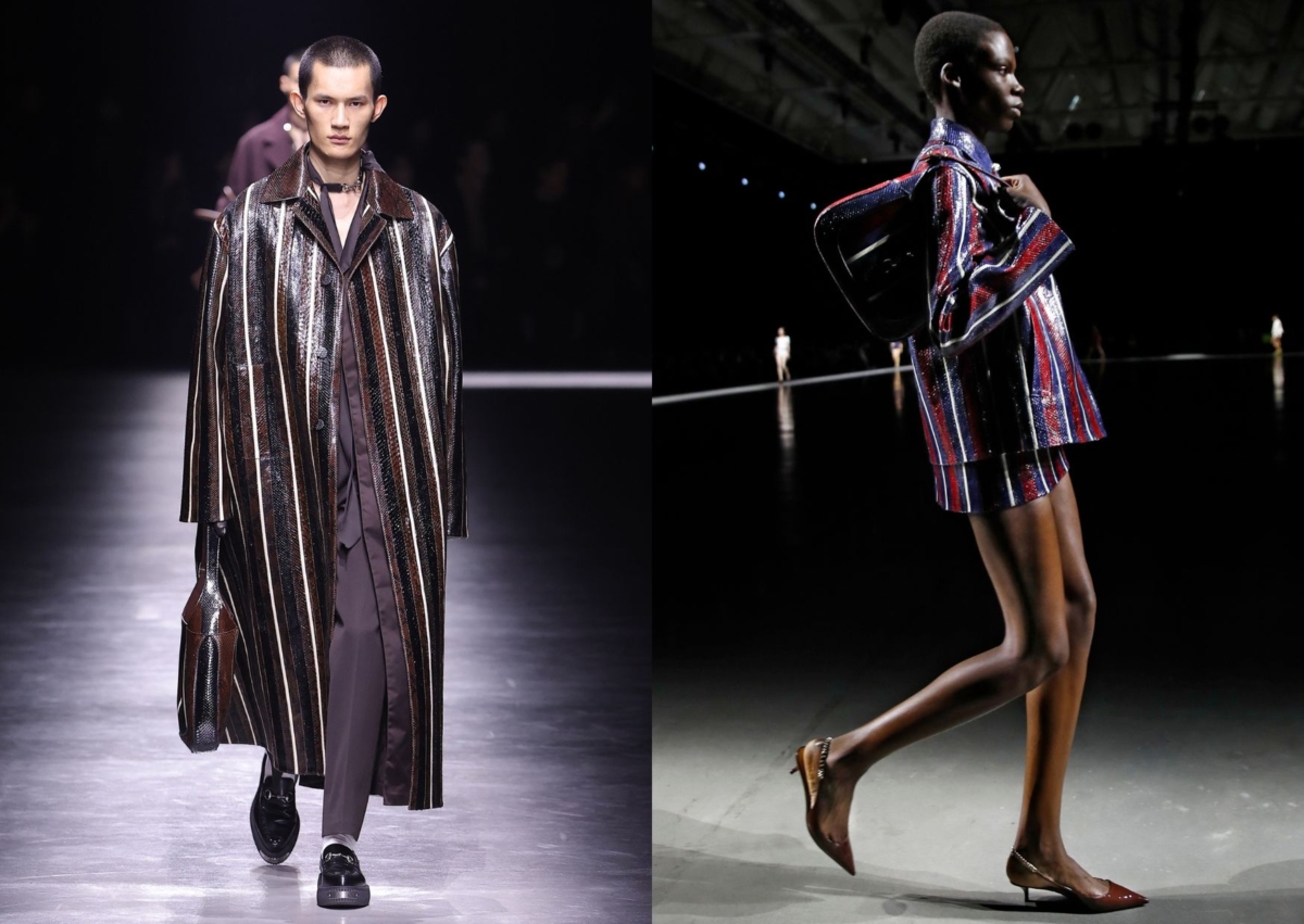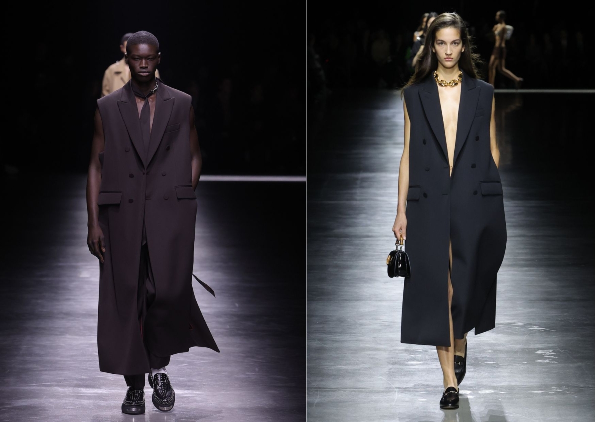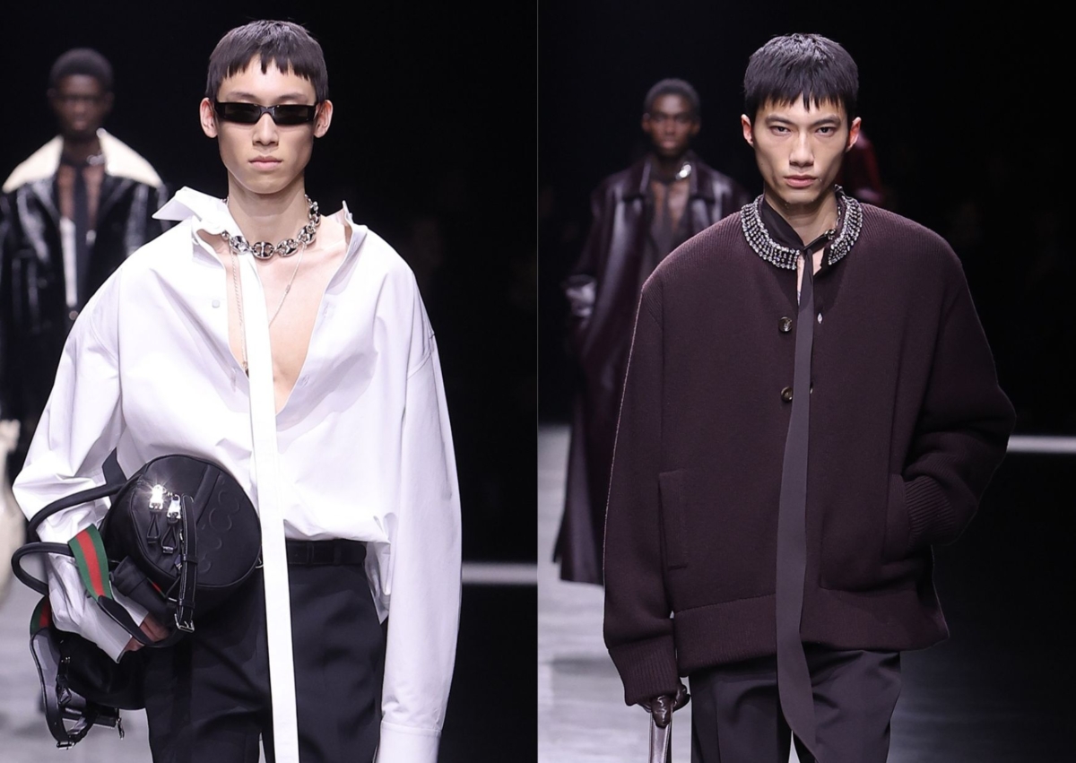 Gucci 創意總監 Sabato De Sarno 首個男裝系列同樣以「Gucci Ancora」為大秀主題,從秀場背景、音樂到服裝造型都與去年9月登場的上任首秀 Gucci Ancora 2024 春夏女裝系列有一致性,Ancora 指的就是「再一次」,同時暗指著本次男裝秀將以女裝為發想再來一次,另外也想讓觀眾再次愛上 Gucci 的解釋,因此在服裝上可以發現多套都從女裝做延伸,看似設計相同,但對於重新復刻需要以男裝思維去重塑線條和設計的難度,Sabato De Sarno 卻做得如此細膩又迷人。