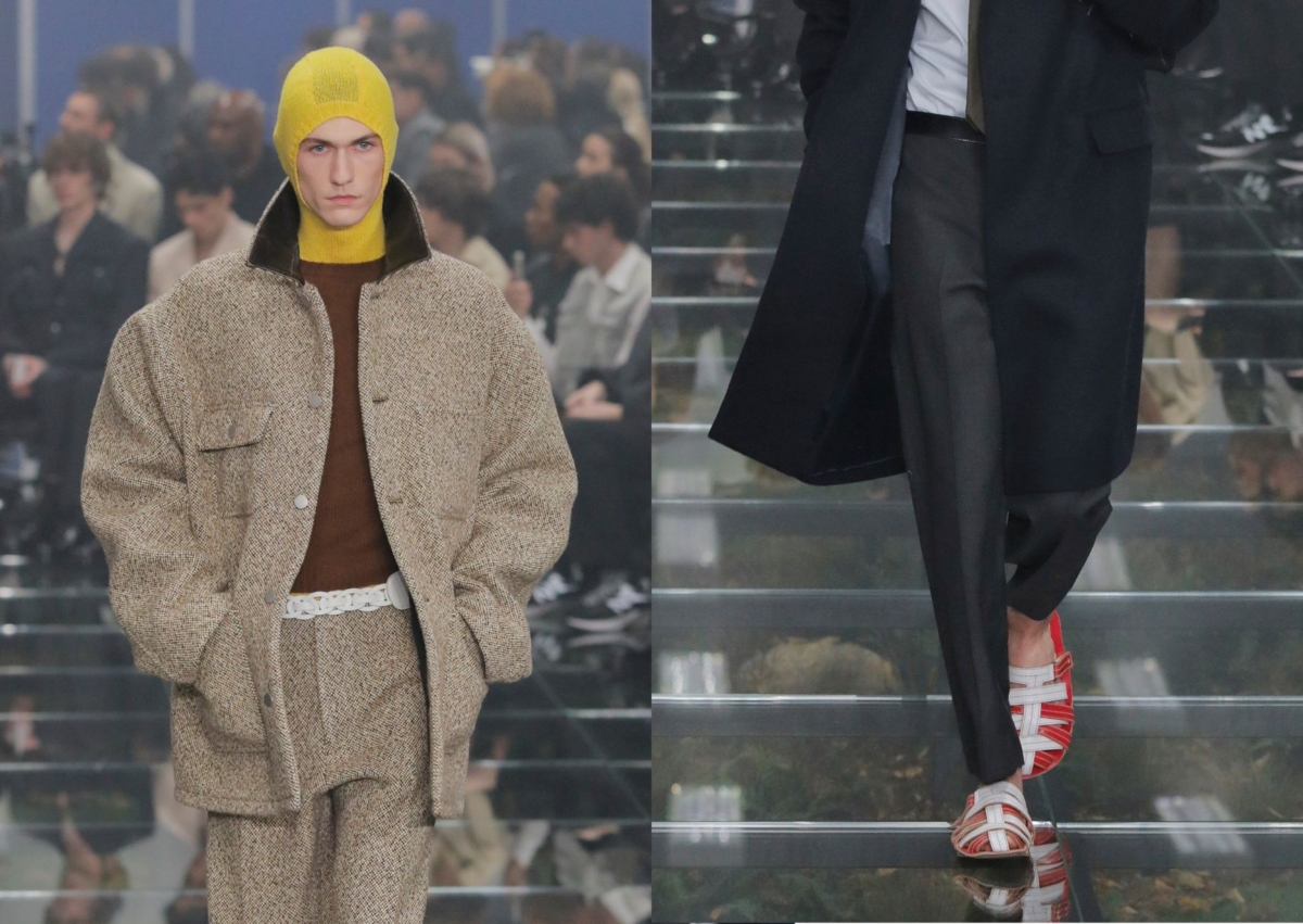Prada 本季男裝系列由 Miuccia Prada和Raf Simons 共同設計,以「辦公室服裝」為題,連秀場空間都打造成辦公室,同時自然景觀也在其中,形成一種既突兀又奇特的場景,系列加入創意的二元性,充斥著大量的混搭碰撞,像是打著領帶的辦公正裝搭配彩色貼頭毛帽、腳踩海灘風格的皮革編織拖鞋,接著戶外實穿的單品接續而來,像是在正裝與休閒中找到平衡點。