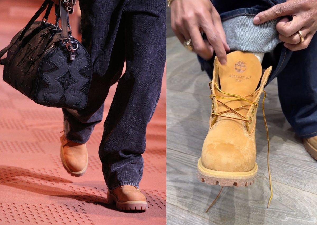 大秀一出時,立刻將話題亮點放在與美國製靴商 Timberland 的聯名靴款,這次的合作重新引起這雙經典黃靴的關注,採用黃褐色或黑色防水 scrivante 磨砂革或鵝卵石磨砂革製成,淺淺凹刻著 LV 經典 Monogram 花紋。