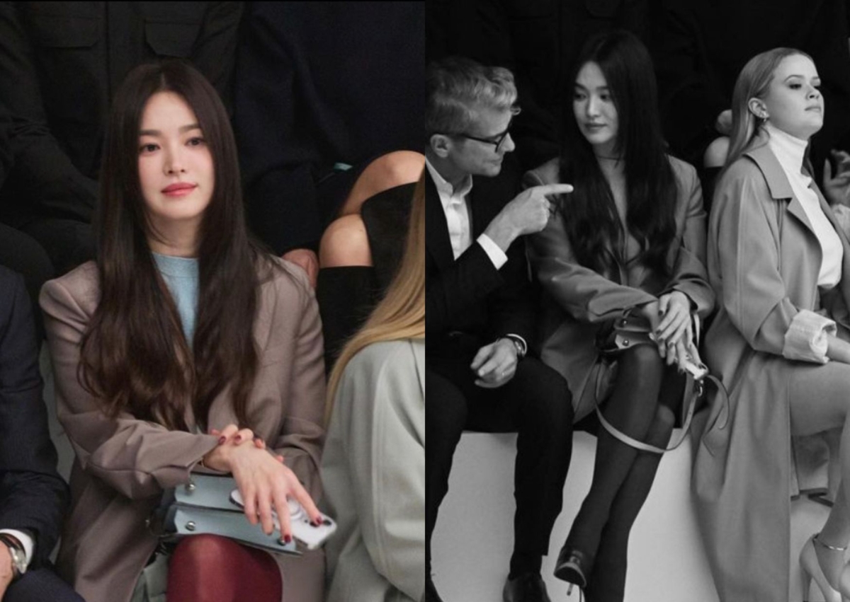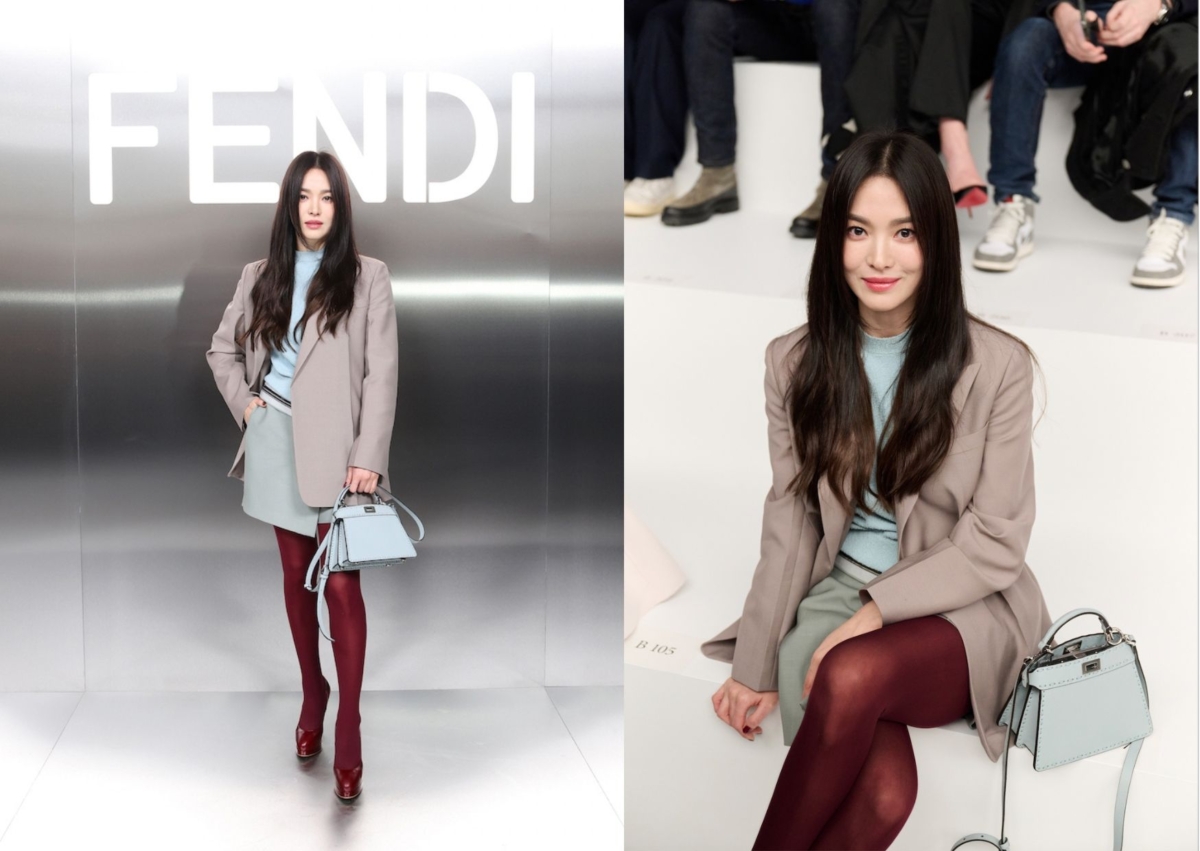 每次出場都美若天仙、絲毫看不出年紀的喬妹宋慧喬,出席 Fendi 2024 春夏高訂大秀身穿 Fendi 淺藍色針織上衣與兩片裙,外搭帶有點藕紫色的大地色西裝外套,看似偏正式的上半身造型,在下半身選擇以最近非常流行的酒紅色絲襪作為穿搭亮點,腳踩同色系厚底高跟鞋拉長比例,既優雅又帶有碰撞衝突感的造型很時髦!