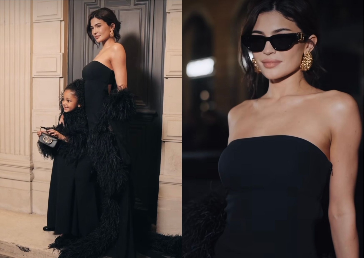 Kylie Jenner 這次帶著女兒 Stormi 一同出席 Valentino 2024春夏高訂大秀,一出場立刻讓大家又驚喜又可愛,兩人都以全黑造型母女裝登場,Kylie Jenner 身穿黑色緊身魚尾禮服,搭配霸氣十足的垂墜黑色毛毛披肩、墨鏡與胡誇金色耳環,女兒 Stormi 則是同樣穿著黑色毛毛圍繞的服裝,手拿小巧的 Valentino 迷你包,模樣好可愛呀!
