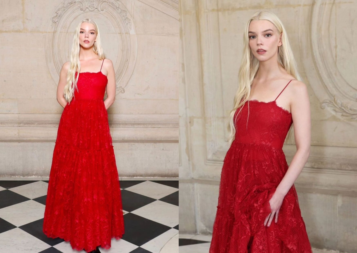 身為 Dior 全球大使的 Anya Taylor-Joy 當然氣勢也不能輸,一如既往的呈現出濃厚的精靈仙女氣息,標誌性金色飄逸長髮,穿著一身 Dior 紅色訂製細肩長禮服,看似強勢亮眼,卻在服裝上帶有蕾絲細節,襯托出更多女人味氣息,果真有種仙女下凡的浪漫氛圍!