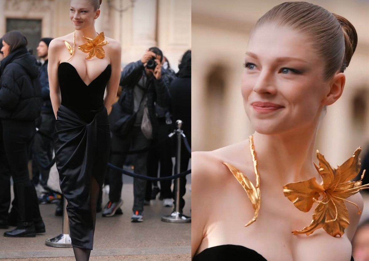 最後這位全球最美的跨性別模特兒 Hunter Schafer 近來年成為各大精品品牌的摯友及寵兒,擁有既是甜美又深邃的精緻臉孔,這次也身穿一身黑色超低胸綁結禮服出席 Schiaparelli 高訂大秀,腰間的垂墜設計更凸顯腰線身材,頸上特意掛著金屬製的花卉造型,成為整身亮點!