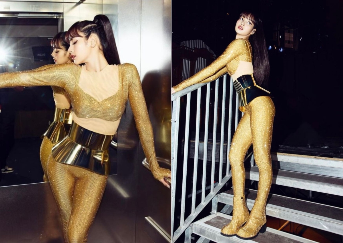 Lisa 出席巴黎慈善晚宴演出時,身上這套金色水鑽緊身衣和金屬馬甲腰封全來自 LOEWE 的訂製造型,上半身是公主復古胸型剪裁的長袖,下半身則是同系列、材質的緊身長褲,即使胸前跟腰間都有膚色布料圍住,仍然擋不住火辣好身材,另外搭配金屬腰封馬甲造型,連鞋款都完全覆蓋上金色材質,未來感氣勢十足,一連串在舞台上帶來 Solo《Lalisa》、《MONEY》等歌曲,視覺聽覺上都滿足了!