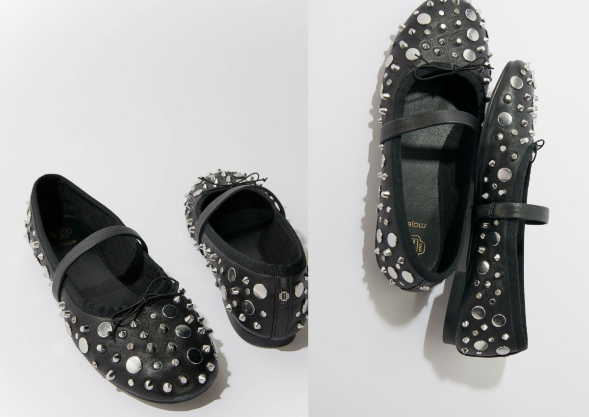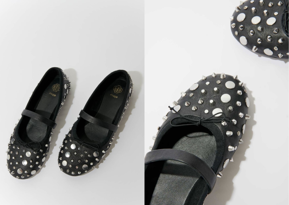 許多女孩最愛的輕奢巴黎時裝品牌 Maje 也推出黑色皮革芭蕾平底鞋,外觀飾有以銀色窩釘、卯丁點綴, 完美展現1990年代的狂野搖滾精神,這款大膽破格的必備鞋款,還可以配搭添上閃石的襪子或單獨穿著,為造型注入時髦個性!