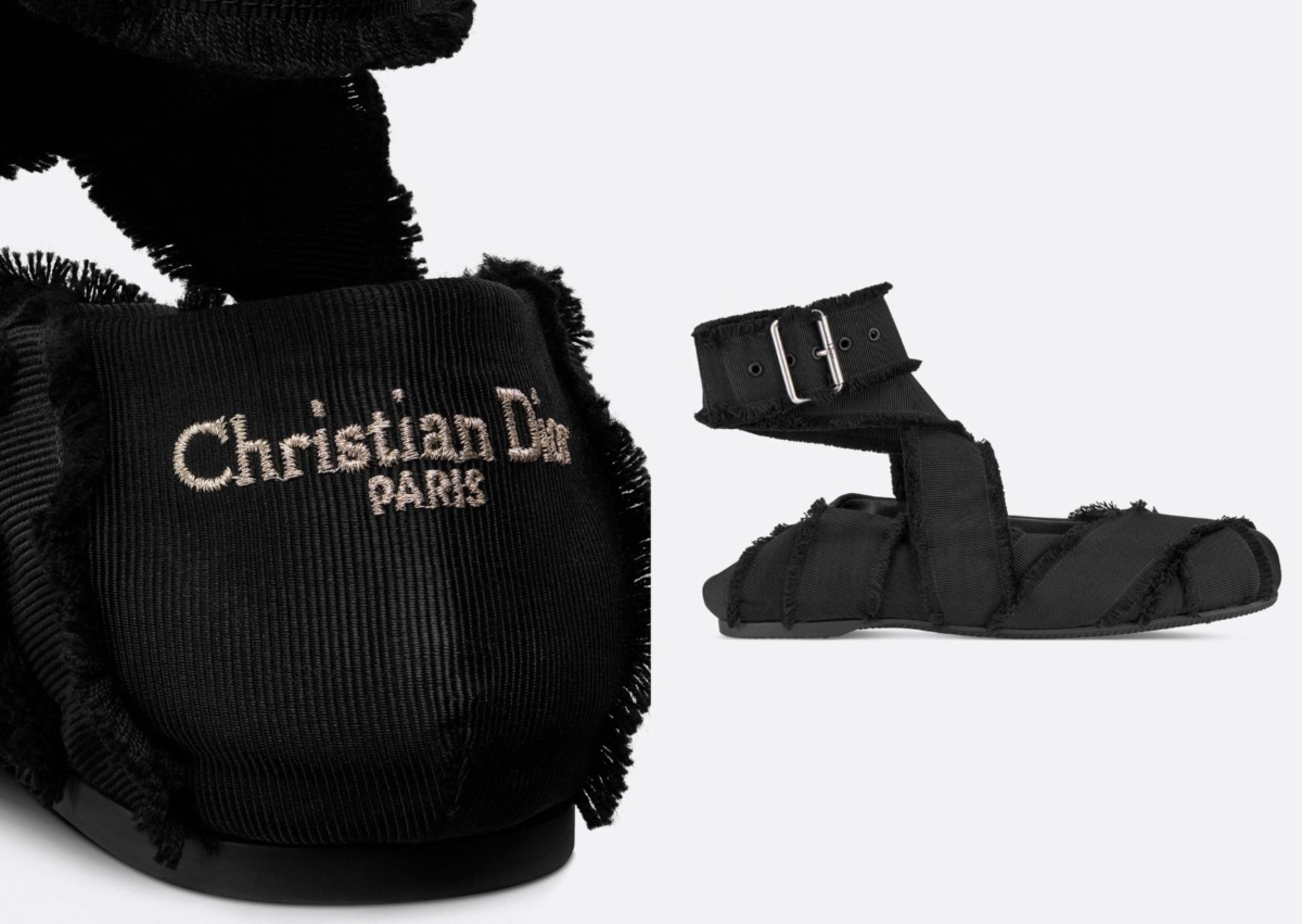 這款 Dior 黑色緞帶流蘇 Dior Songe 芭蕾平底鞋亮相於2024 春夏時裝秀,以超現代風格演繹芭蕾舞鞋,採用經典的正方鞋頭設計,搭配寬版交叉繫帶,可利用扣環調節鬆緊,突顯纖細腳踝。柔軟鞋跟搭配金色 Christian Dior Paris 標誌刺繡,可作為涼鞋或芭蕾平底鞋穿搭,展現高級訂製時裝的風格。